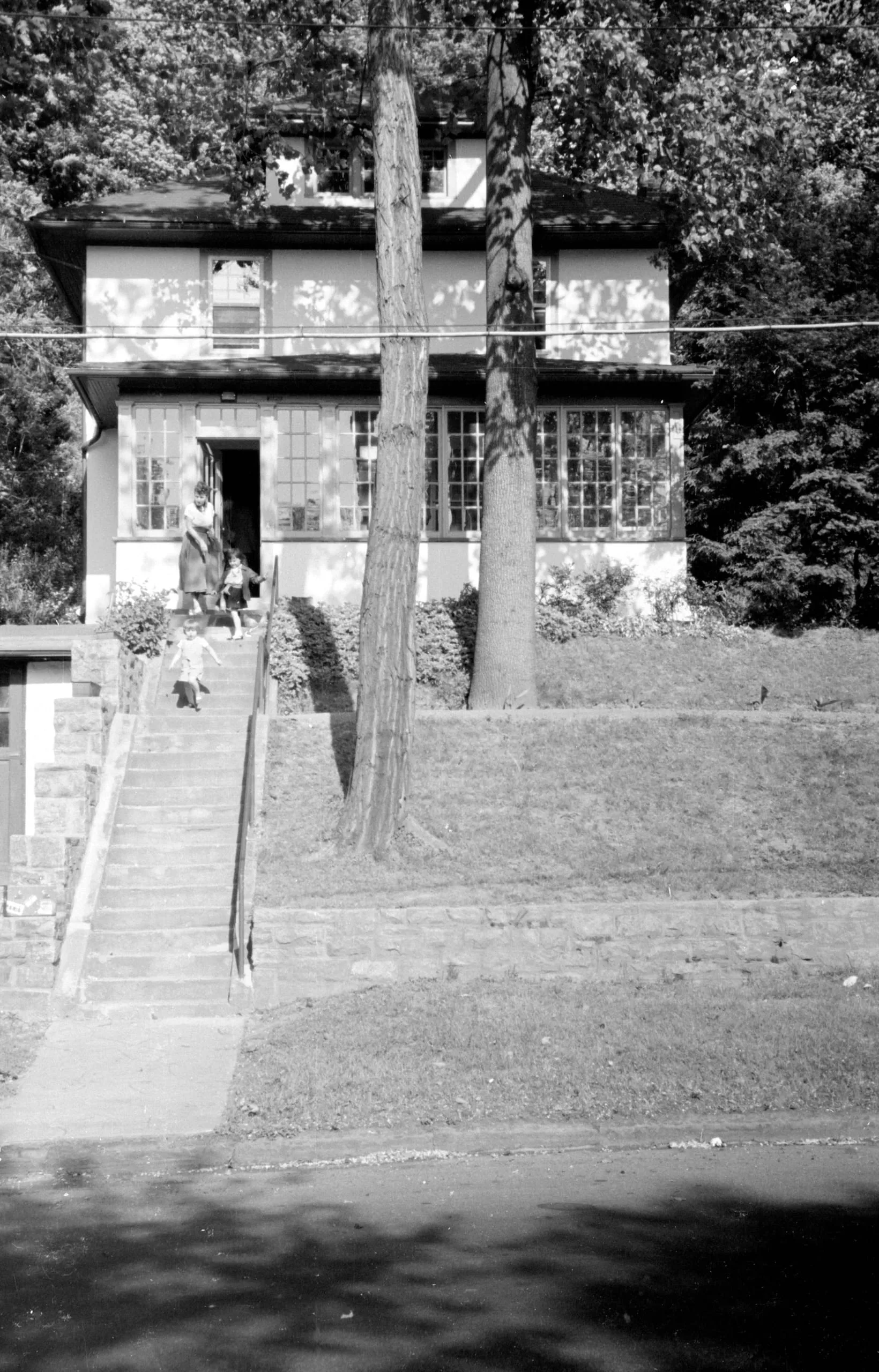 Black and white photograph of a two-story house on a raised lot, with a long staircase leading to the front door and three small figures descending the steps