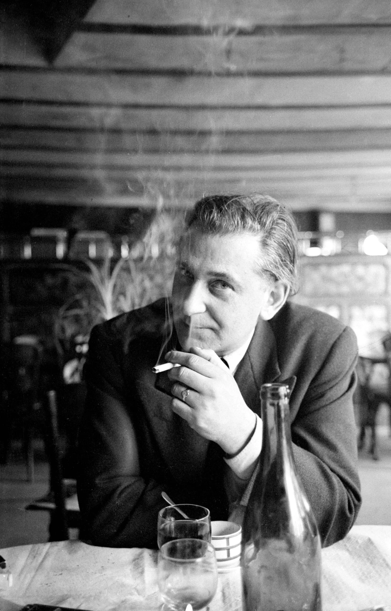 Black and white photograph, white man in a dark blazer seated at a café table, holding a lit cigarette near his chin, gaze directed upward and to the left
