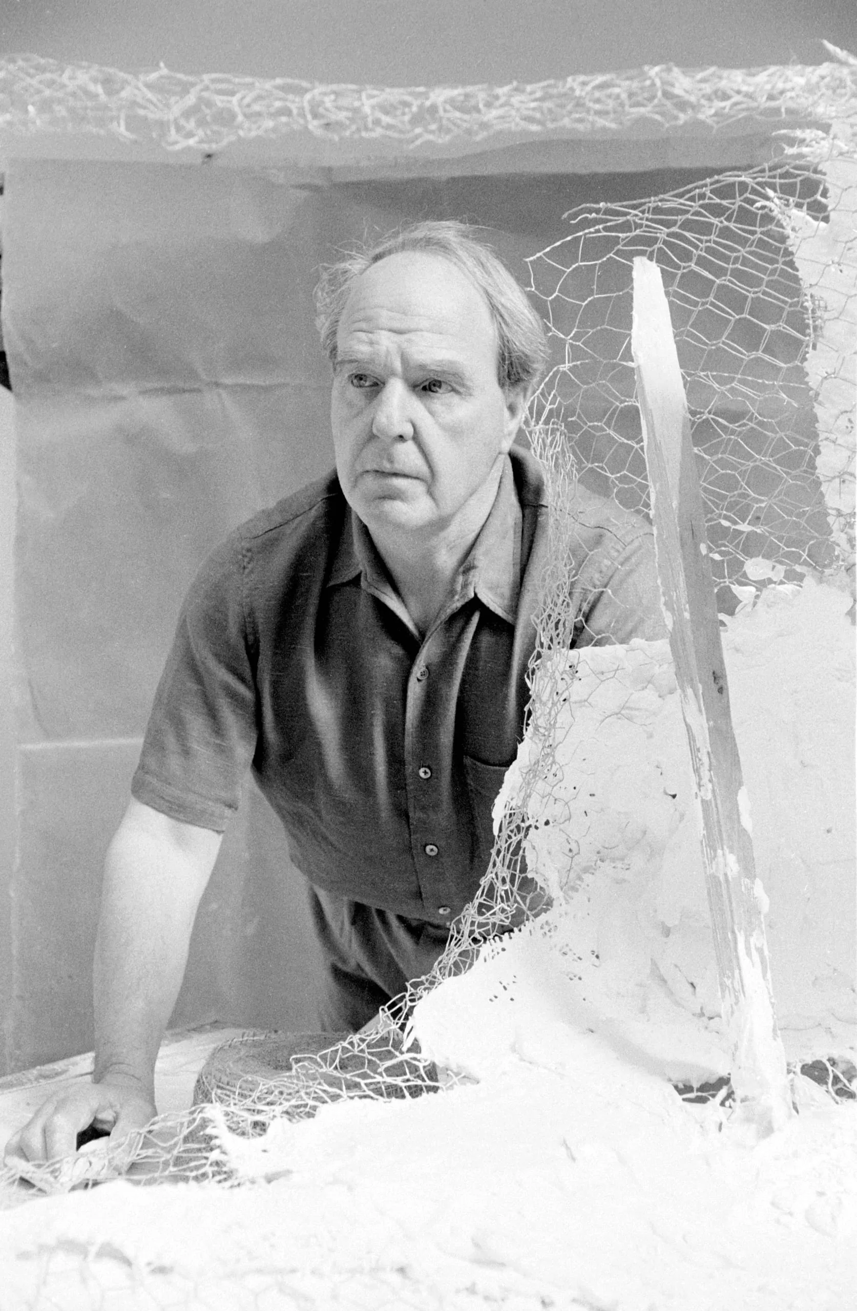 Black and white photograph of a man from the waist up leaning over a plaster-covered wire mesh surface, looking directly at the camera
