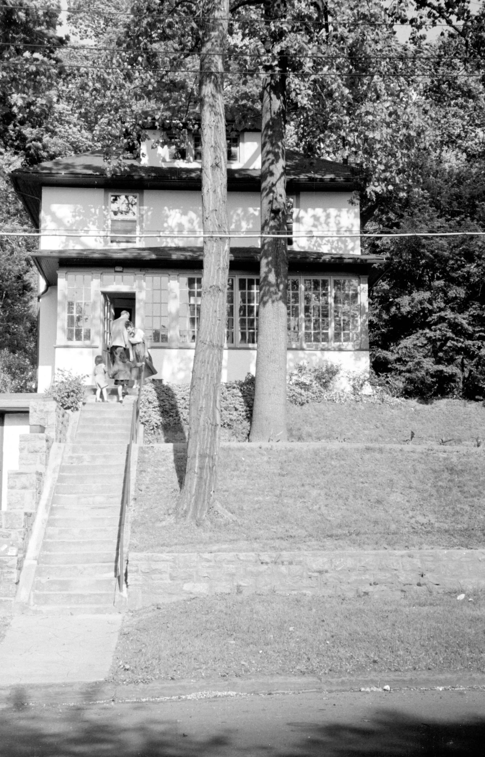 Black and white photograph of a two-story house on a hill, with a long stone staircase, two tall trees, and three small figures on the steps
