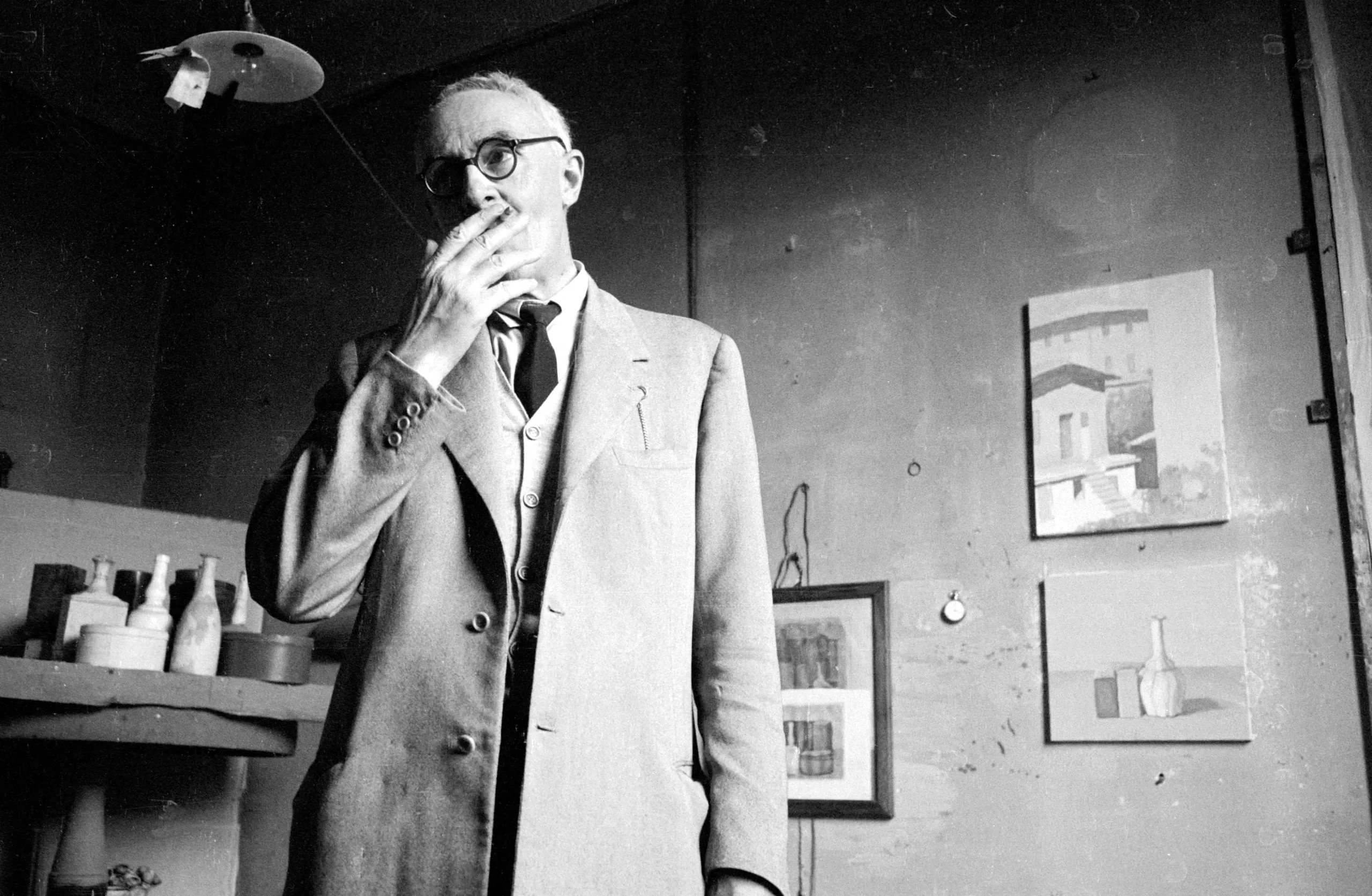 Black and white photograph of a white man in a suit and round glasses holding a cigarette to his lips, standing in an artist's studio with paintings visible on the wall behind him