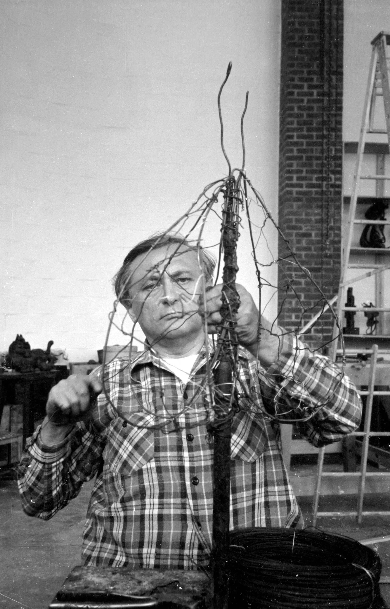 Black and white photograph of a man in a plaid shirt holding a wire and twig sculptural armature in a studio setting