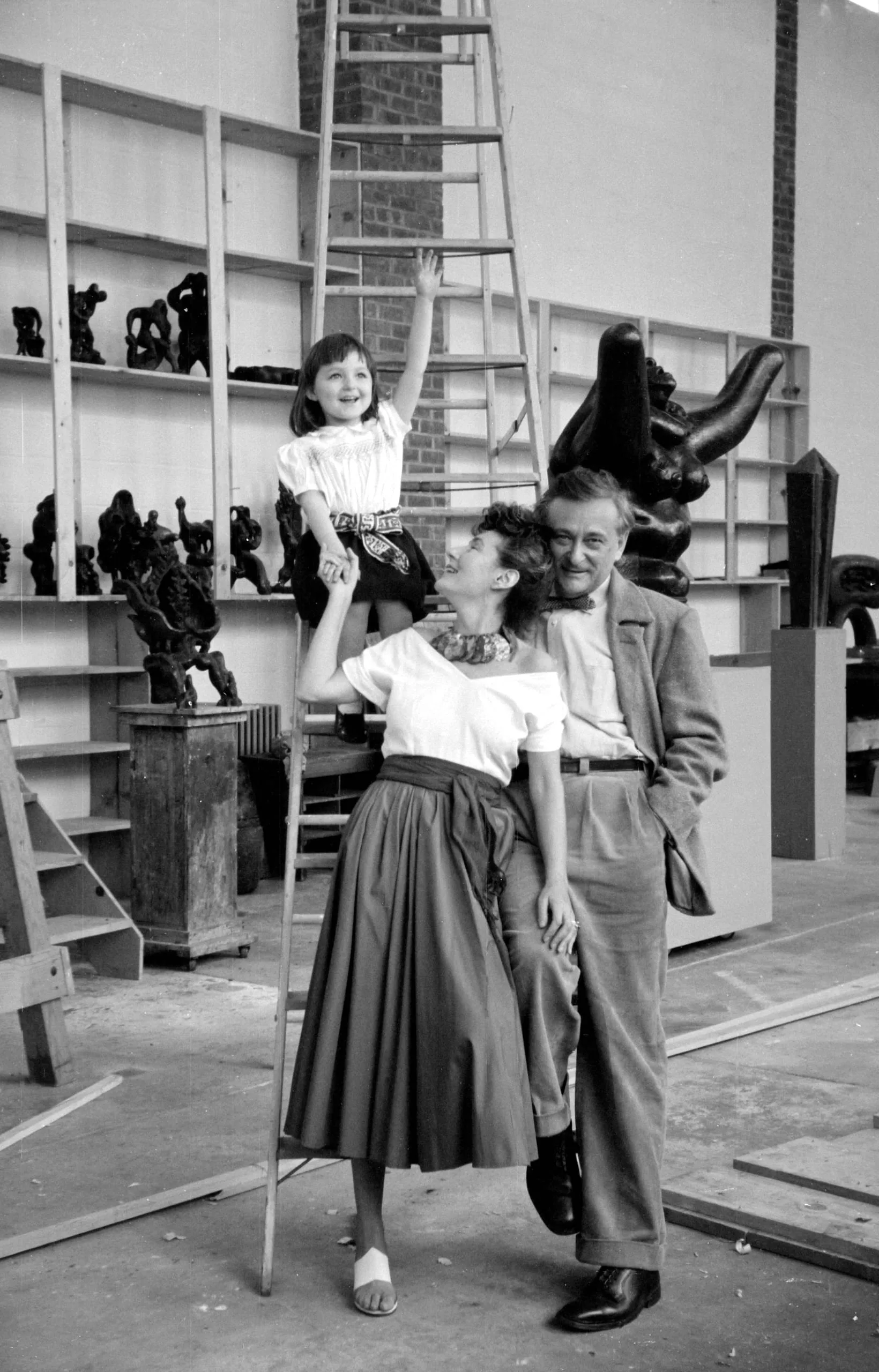 Black and white photograph of a man, woman, and young girl posing playfully in a sculptor's studio surrounded by dark bronze figurative works