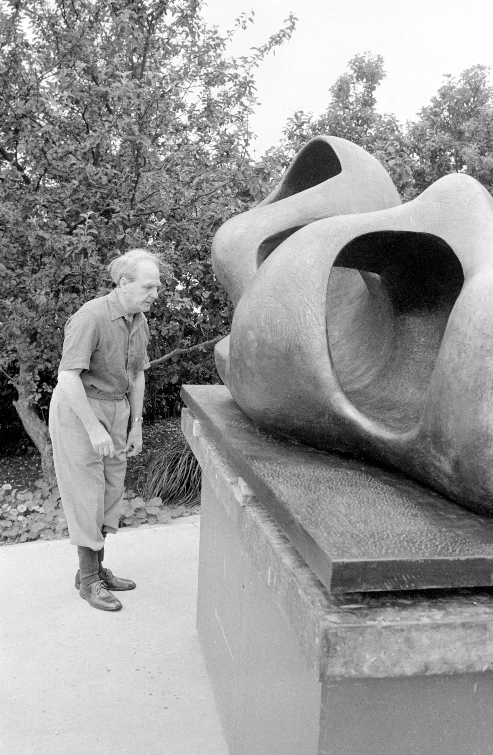 Black and white photograph of an older man in profile, leaning forward to examine a large abstract bronze sculpture with organic forms and open voids, set outdoors on a concrete pedestal