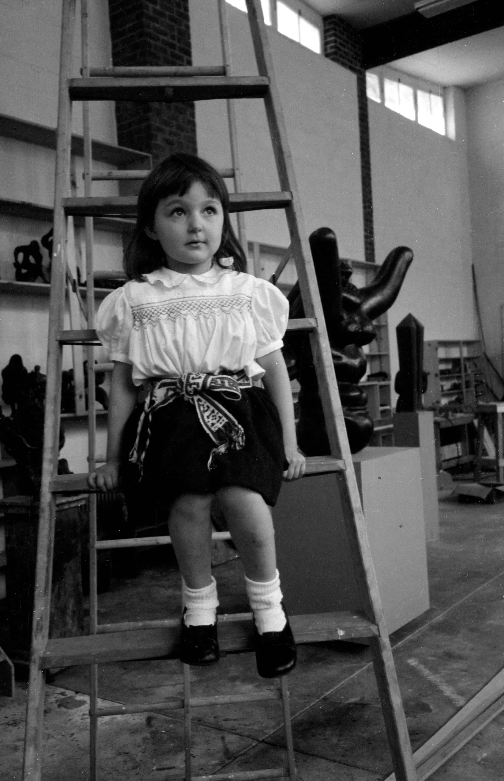 Black and white photograph of a young girl sitting on a stepladder rung in an artist's studio, wearing a smocked blouse, dark skirt, and Mary Jane shoes, looking upward