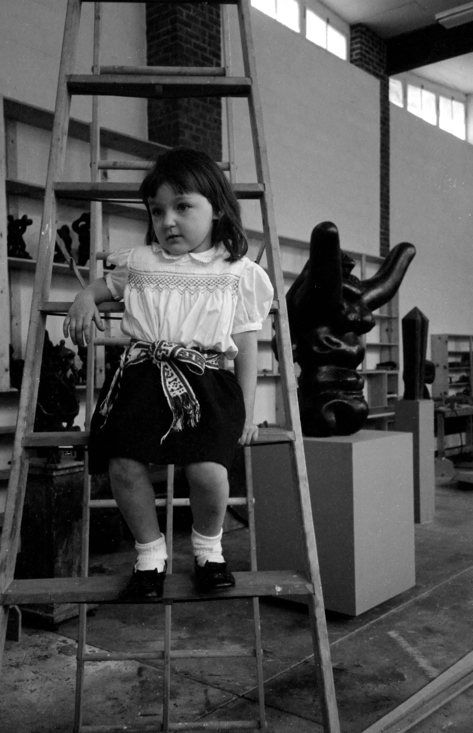 Black and white photograph of a young child standing on the bottom rung of a wooden ladder in an artist's studio, wearing a smocked blouse and dark shorts, with a large dark sculpture on a pedestal behind her