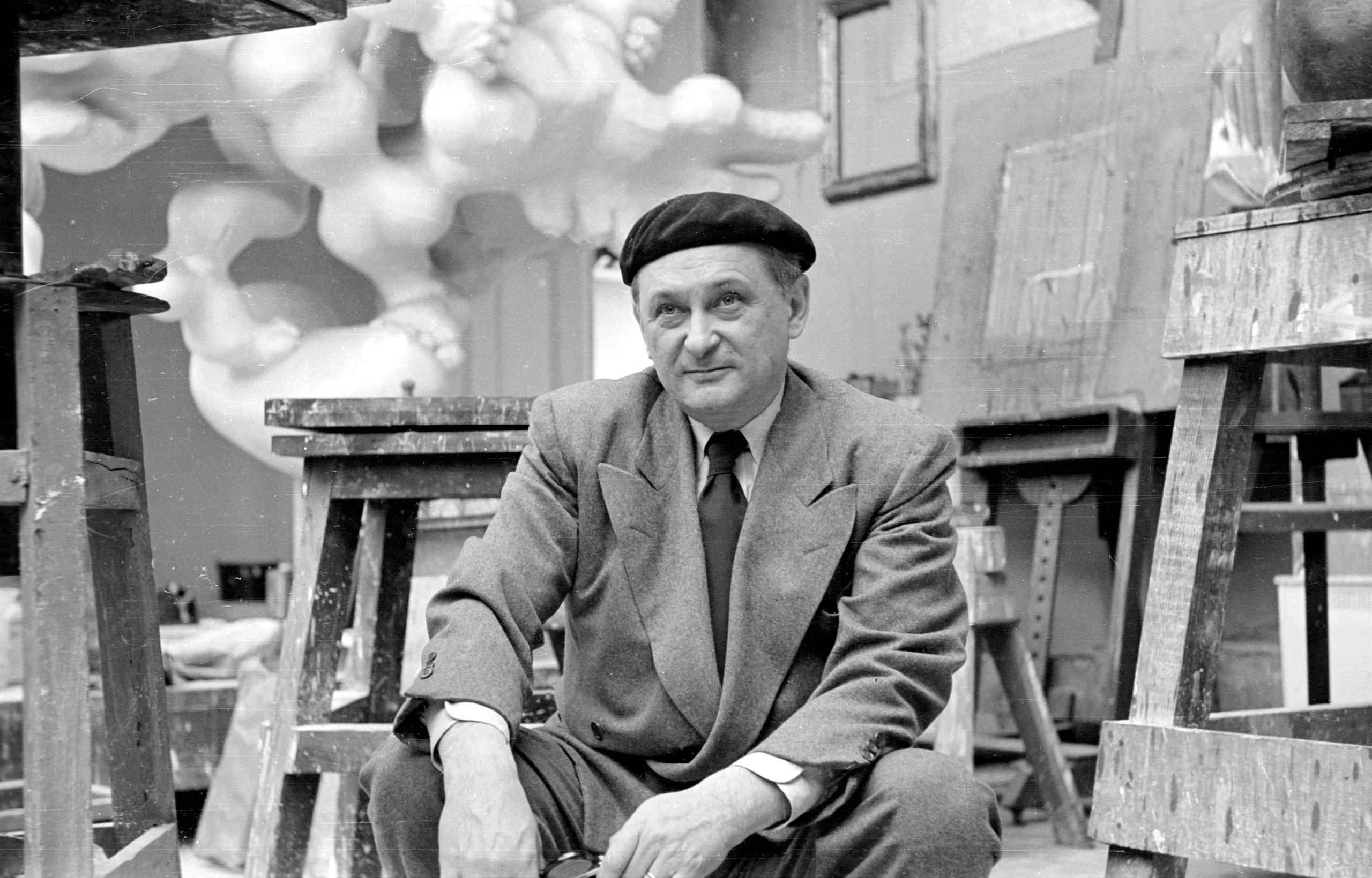 Black and white photograph of a man in a beret and suit jacket seated among wooden sawhorses in a sculptor's studio, with a large pale sculptural form blurred in the background
