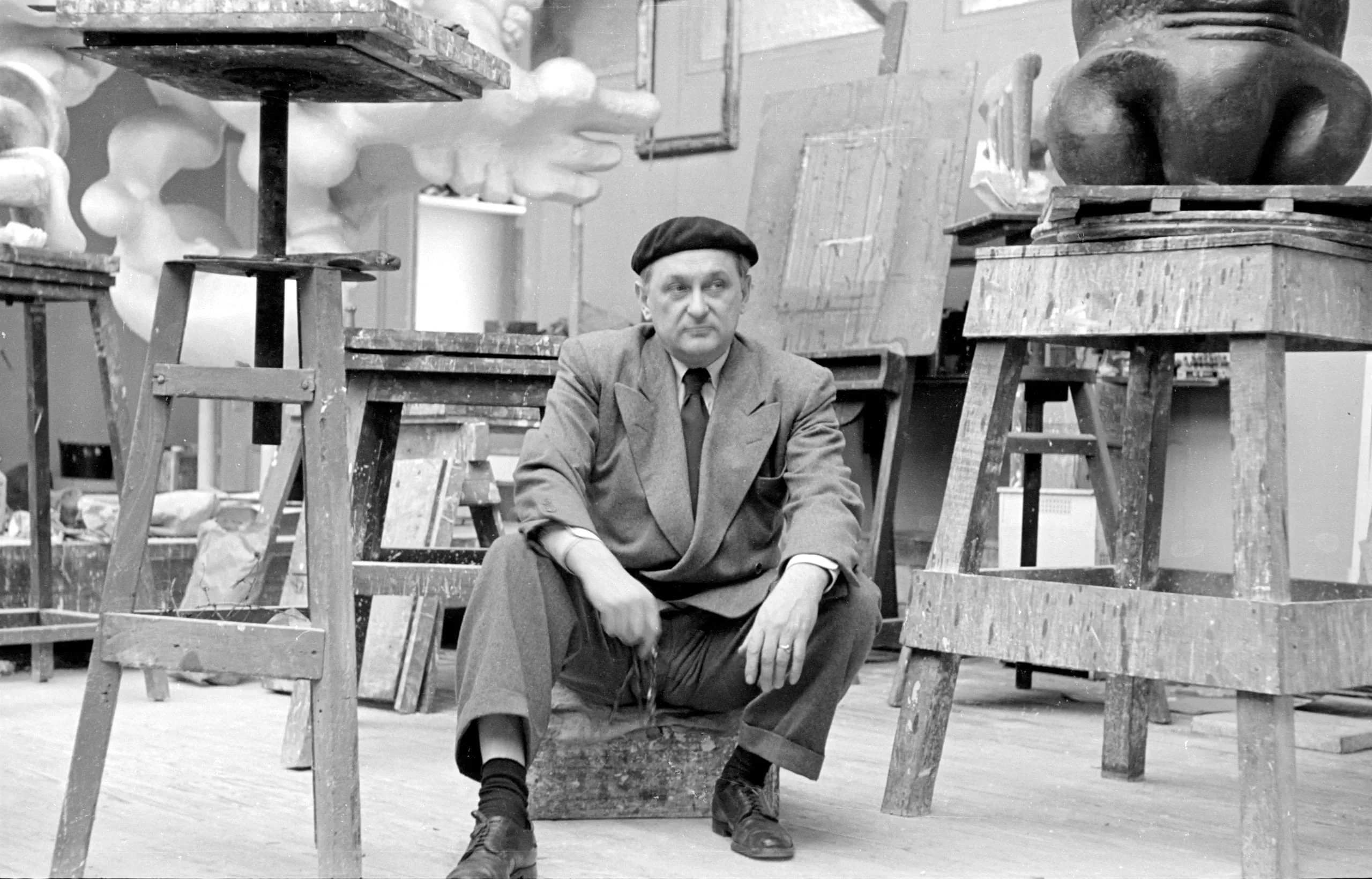 Black and white photograph of a man in a beret and suit seated on a low crate in a sculpture studio, surrounded by large works in progress on wooden stands