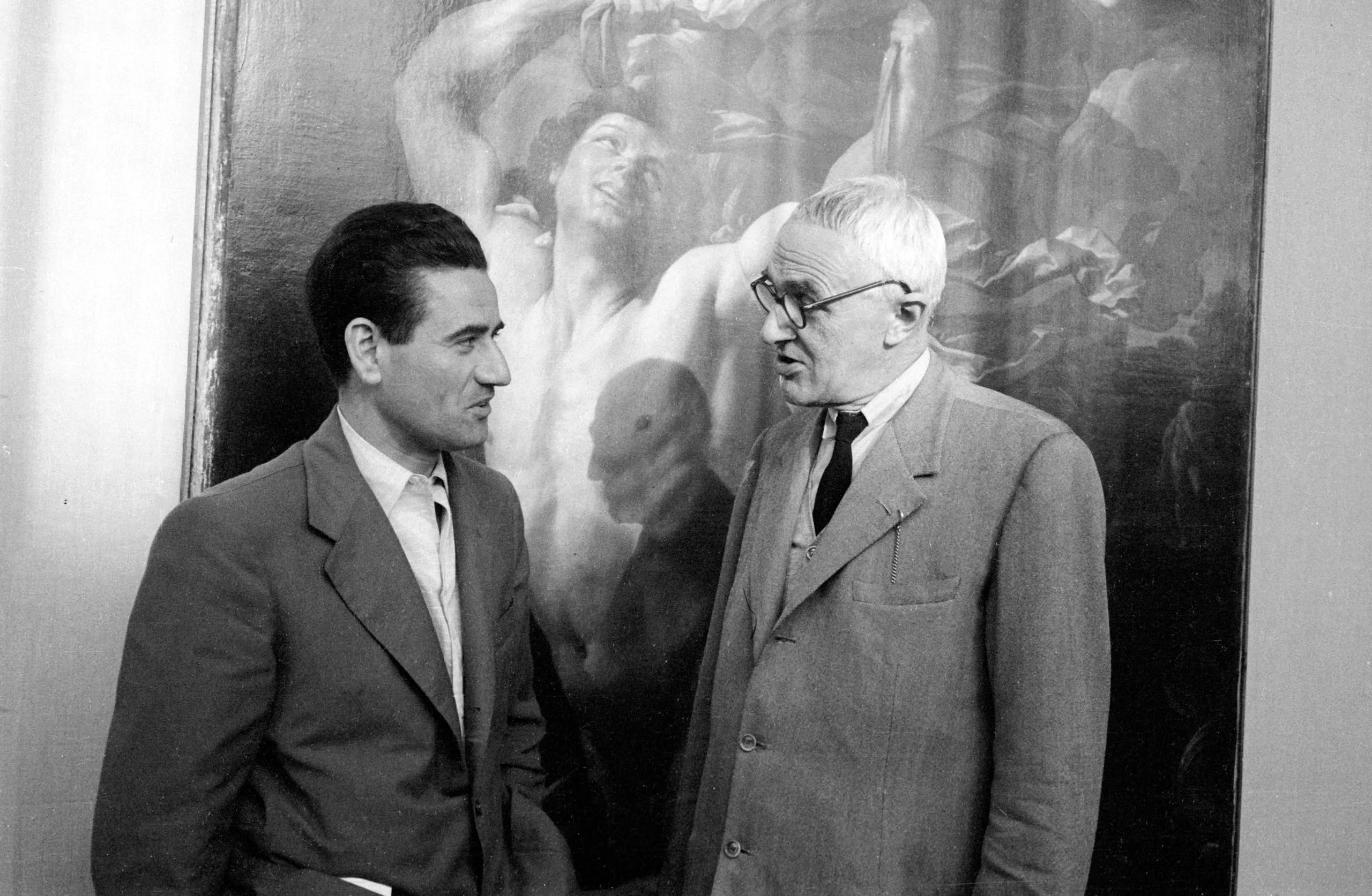 Black and white photograph of two men in suits standing before a large figurative painting, facing each other in conversation