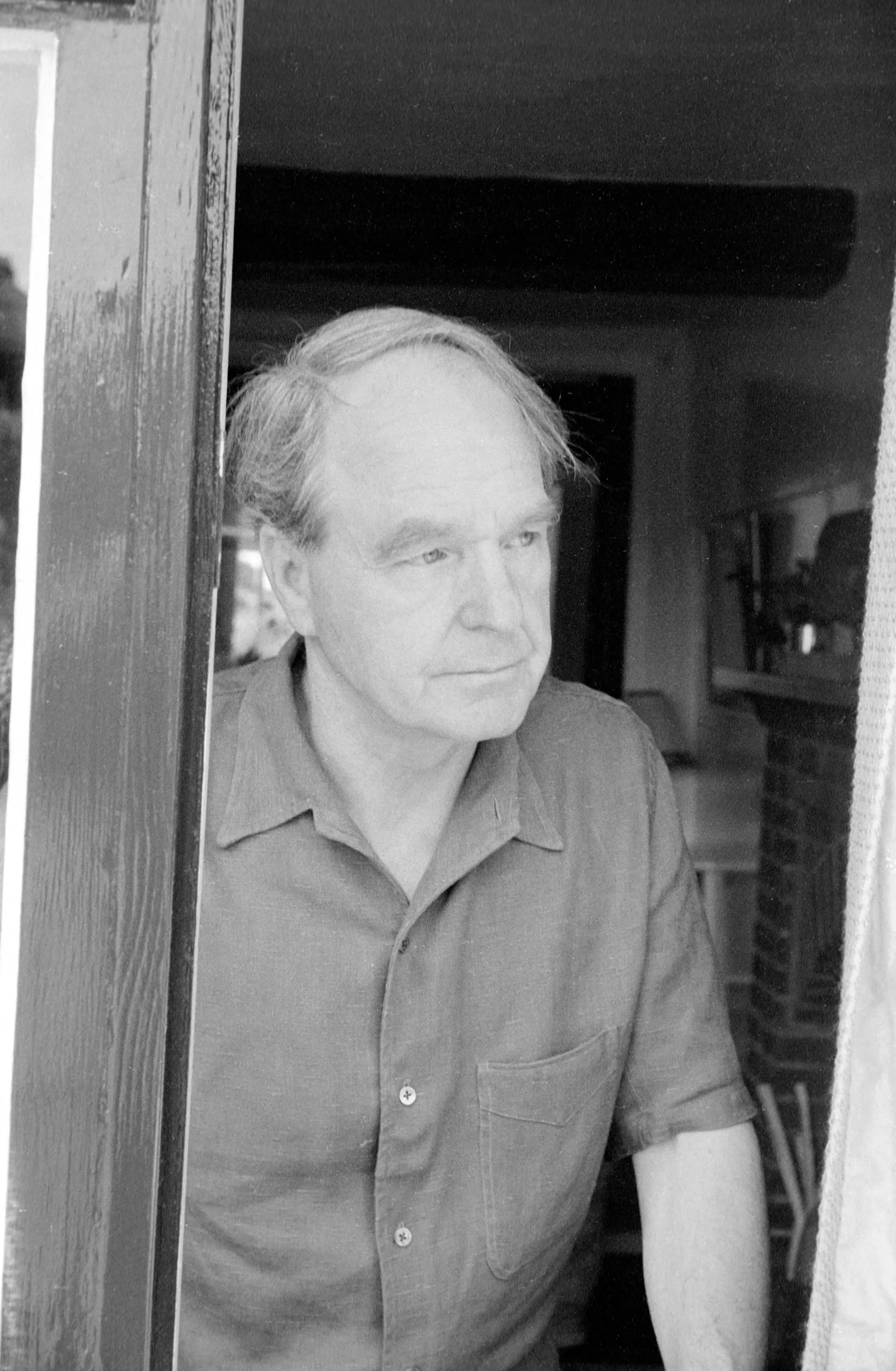 Black and white photograph, chest-up portrait of a white man with thinning gray hair leaning near a dark wooden door frame, looking to the left