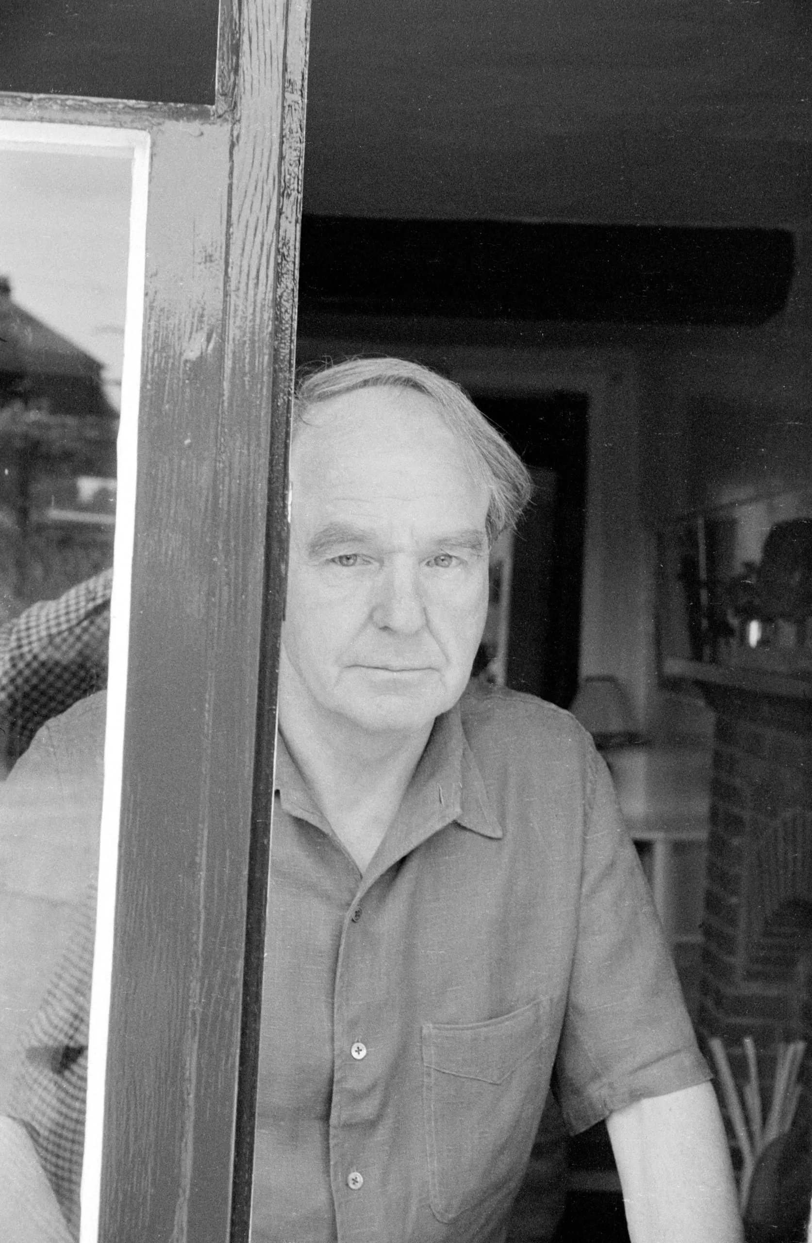 Black and white portrait photograph, white man with gray hair in a short-sleeved shirt, standing in a partially open doorway, looking directly at the camera