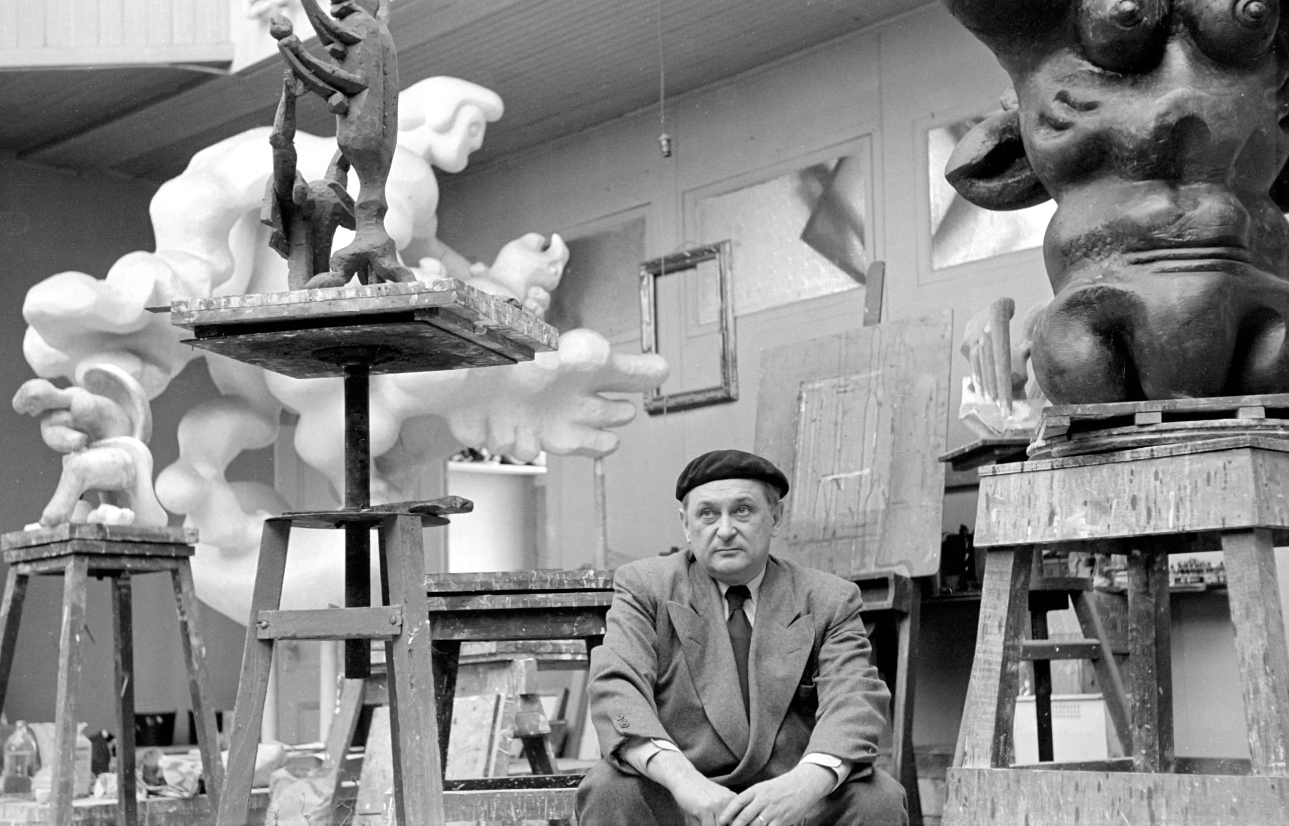 Black and white photograph of a man in a beret and jacket seated in a sculptor's studio, surrounded by large white plaster and dark figurative sculptures on wooden stands