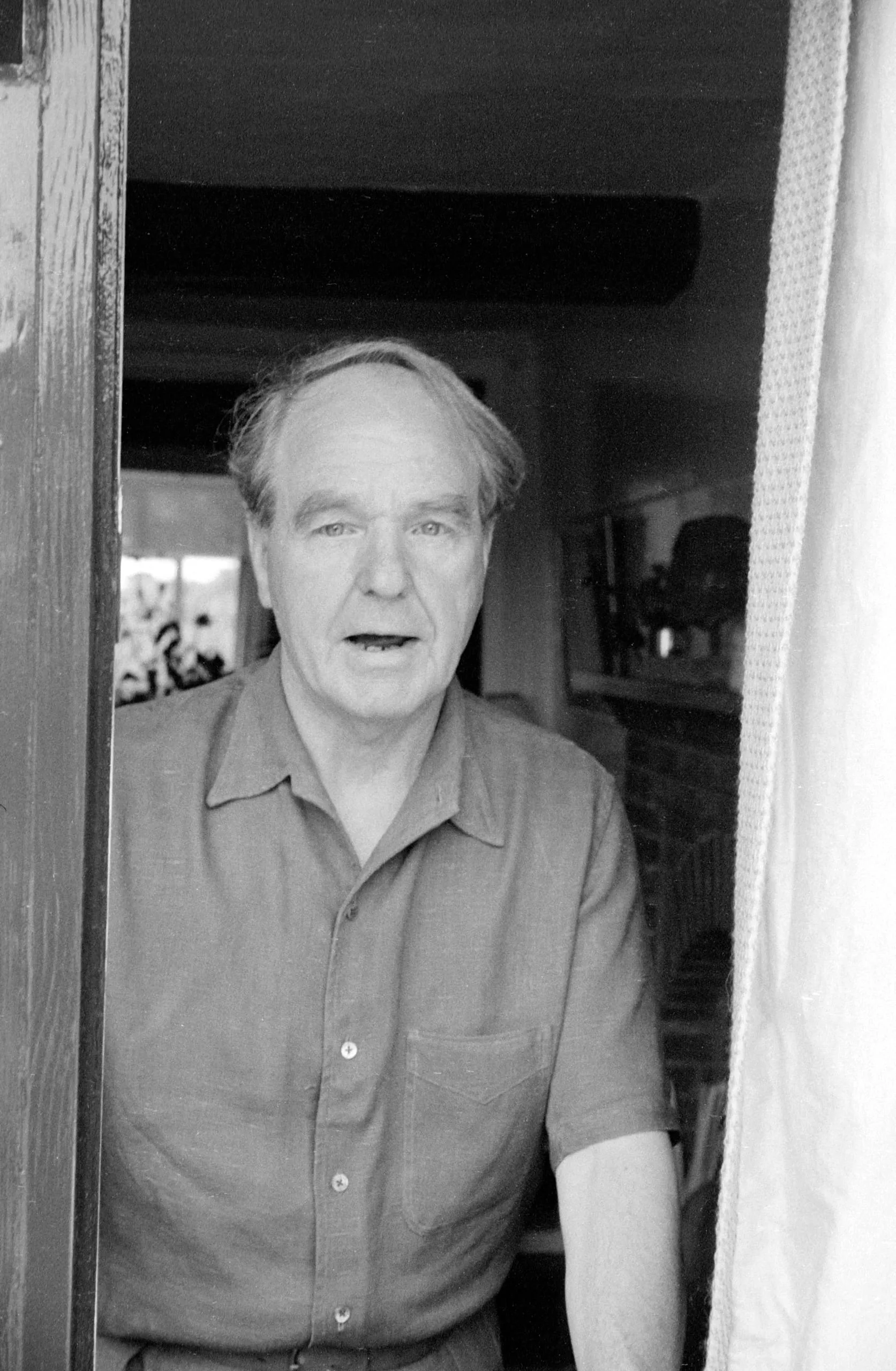 Black and white photograph of a white man in a short-sleeved button-up shirt, framed in an open wooden doorway, looking directly at the camera