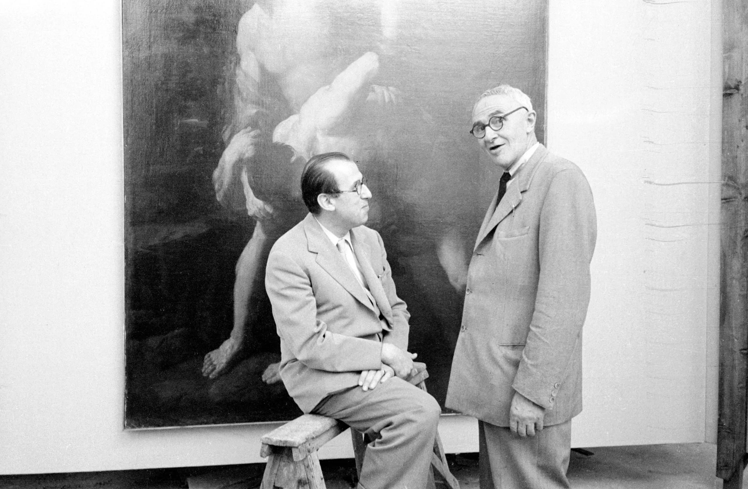 Black and white photograph of two men in suits before a large dark painting, one seated on a wooden bench, one standing, both with mouths open mid-conversation