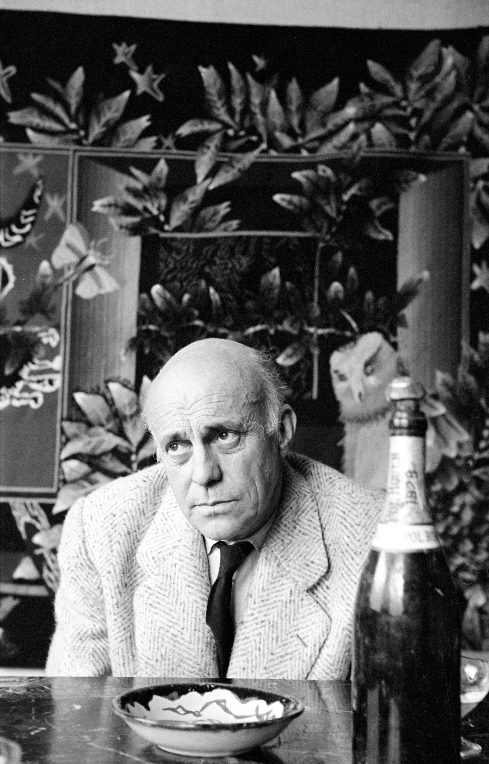 Black and white photograph, portrait of a bald, heavyset white man in a herringbone jacket and dark tie, seated at a table with a bottle and bowl, against leafy patterned wallpaper