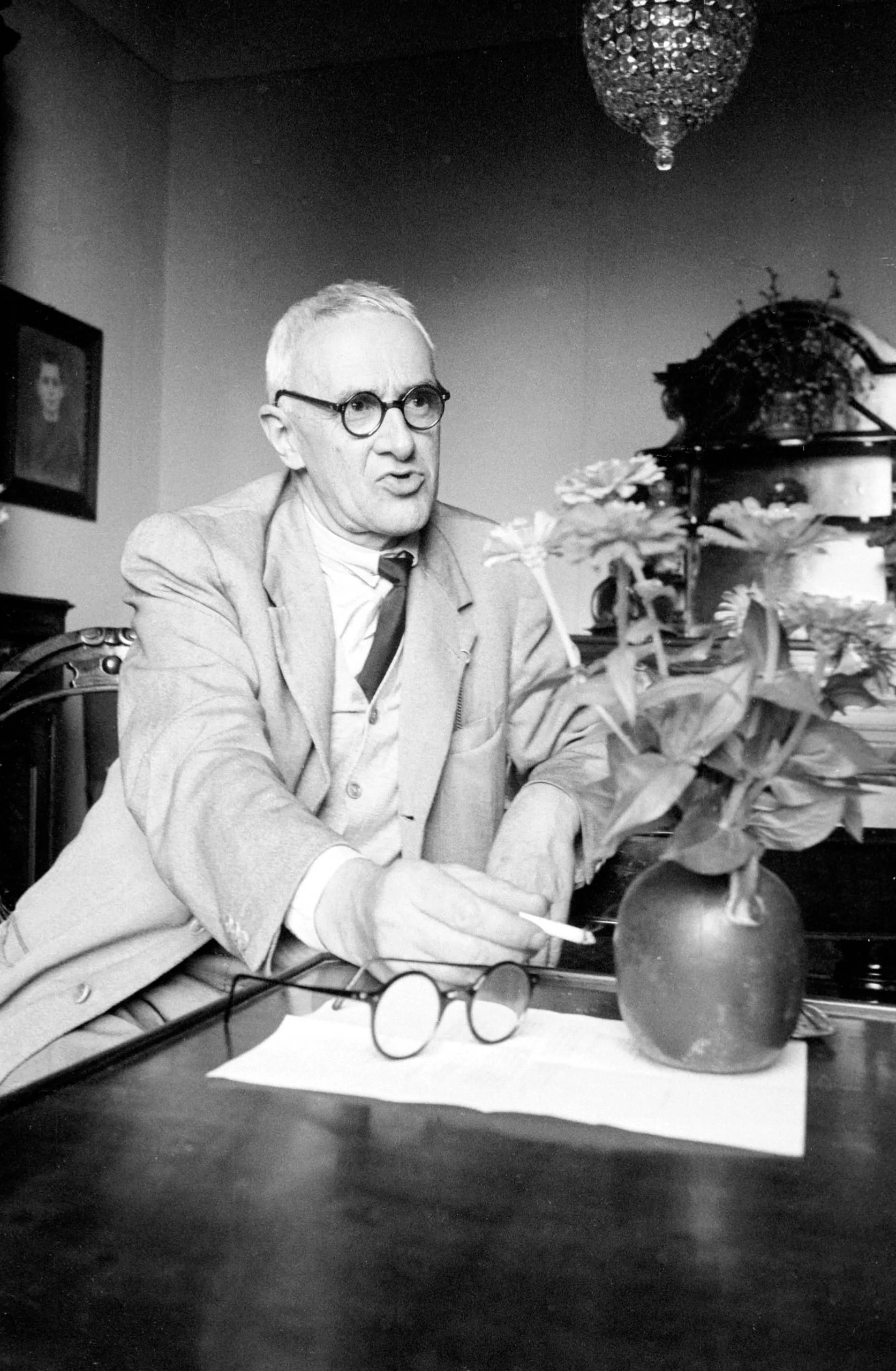 Black and white photograph of a white man with round glasses seated at a desk, holding a cigarette, with a flower vase and spare glasses on the table