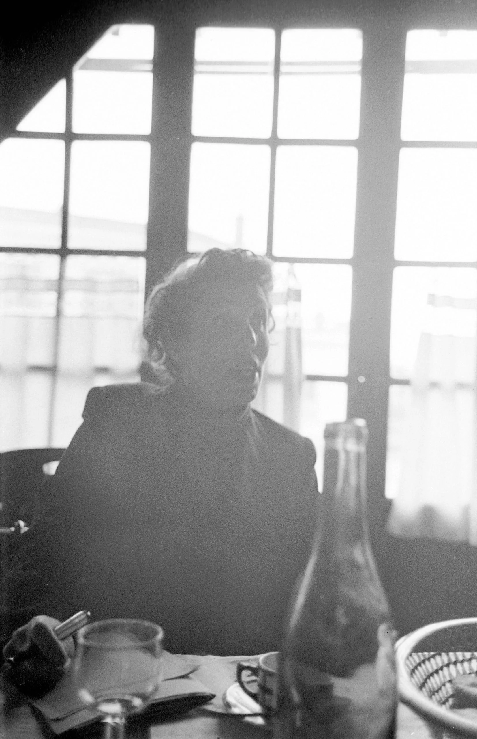 Black and white photograph of a figure seated at a table, heavily backlit by a large window, face in deep shadow, bottle and cup visible in the foreground