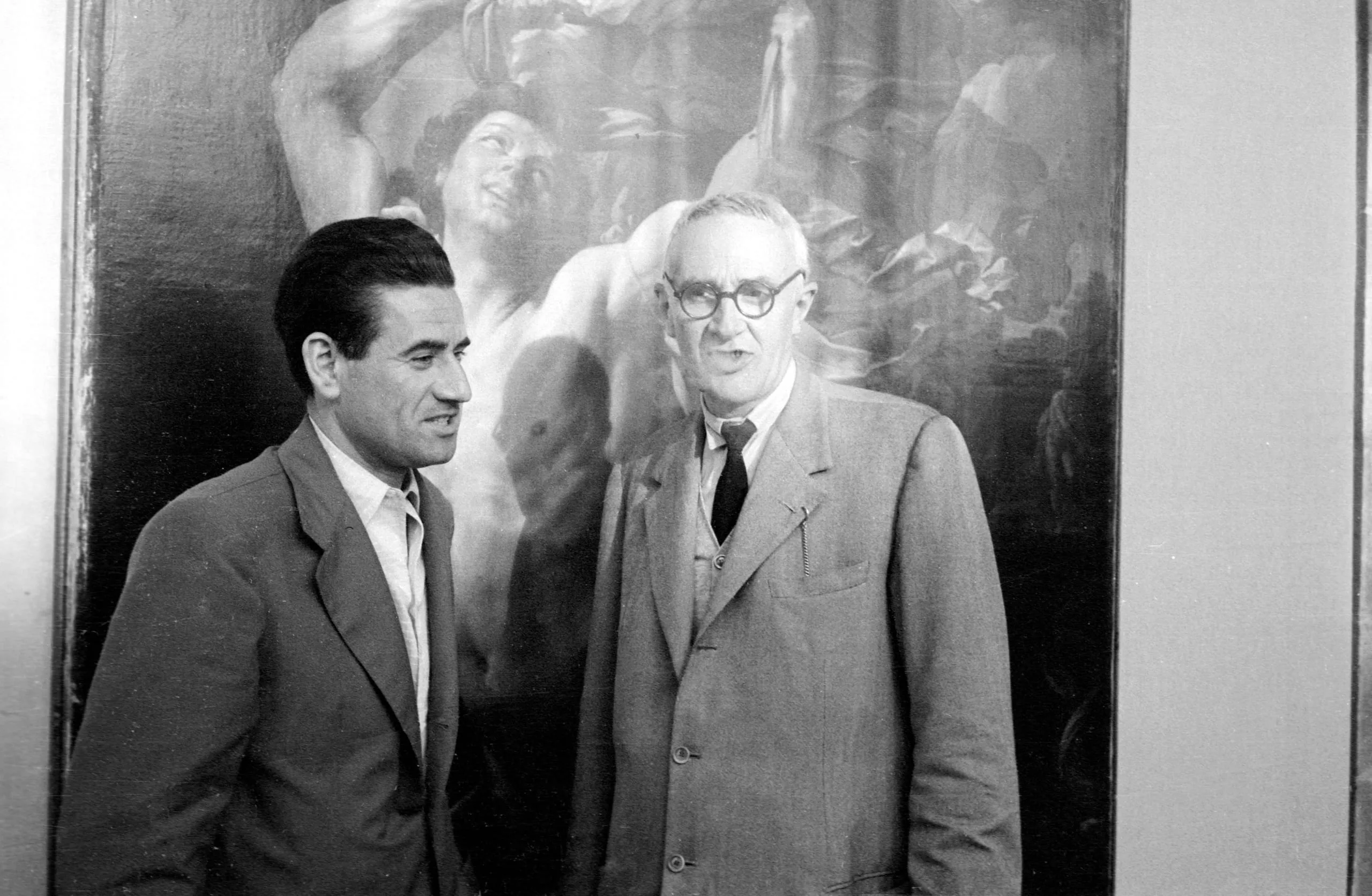 Black and white photograph of two men in suits standing in front of a large figurative painting with muscular figures