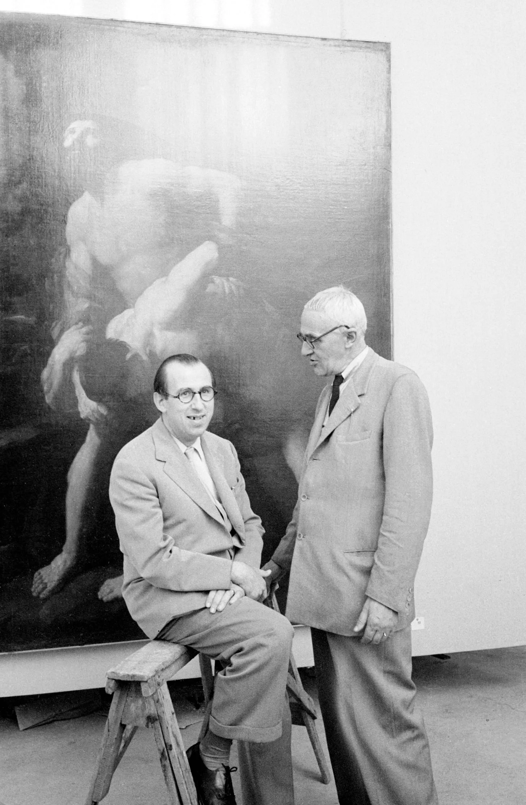 Black and white photograph of two men in suits conversing in front of a large, dark Baroque-style painting with a dramatically lit nude figure