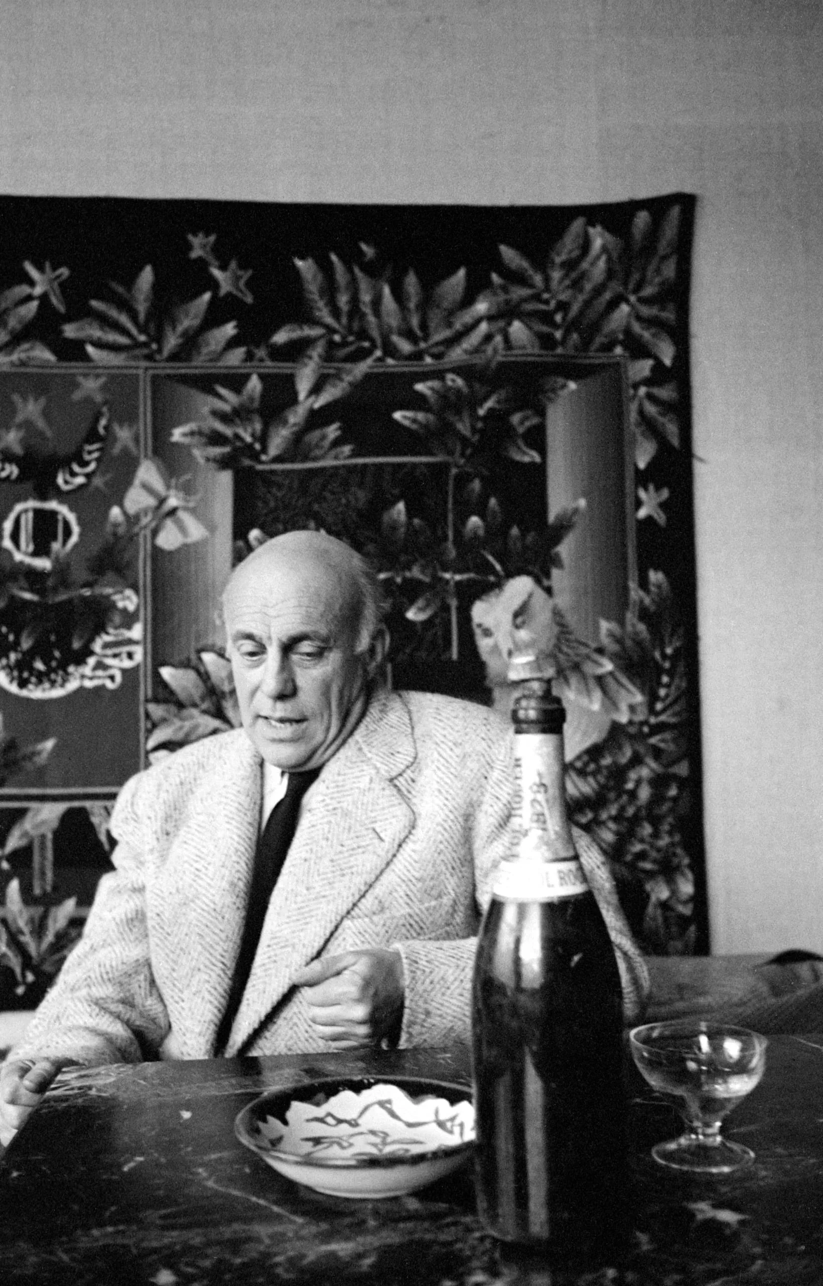 Black and white photograph, bald white man in a tweed blazer seated at a dark table, looking down, with a bottle, glass, and ceramic bowl before him and a leaf-patterned tapestry behind