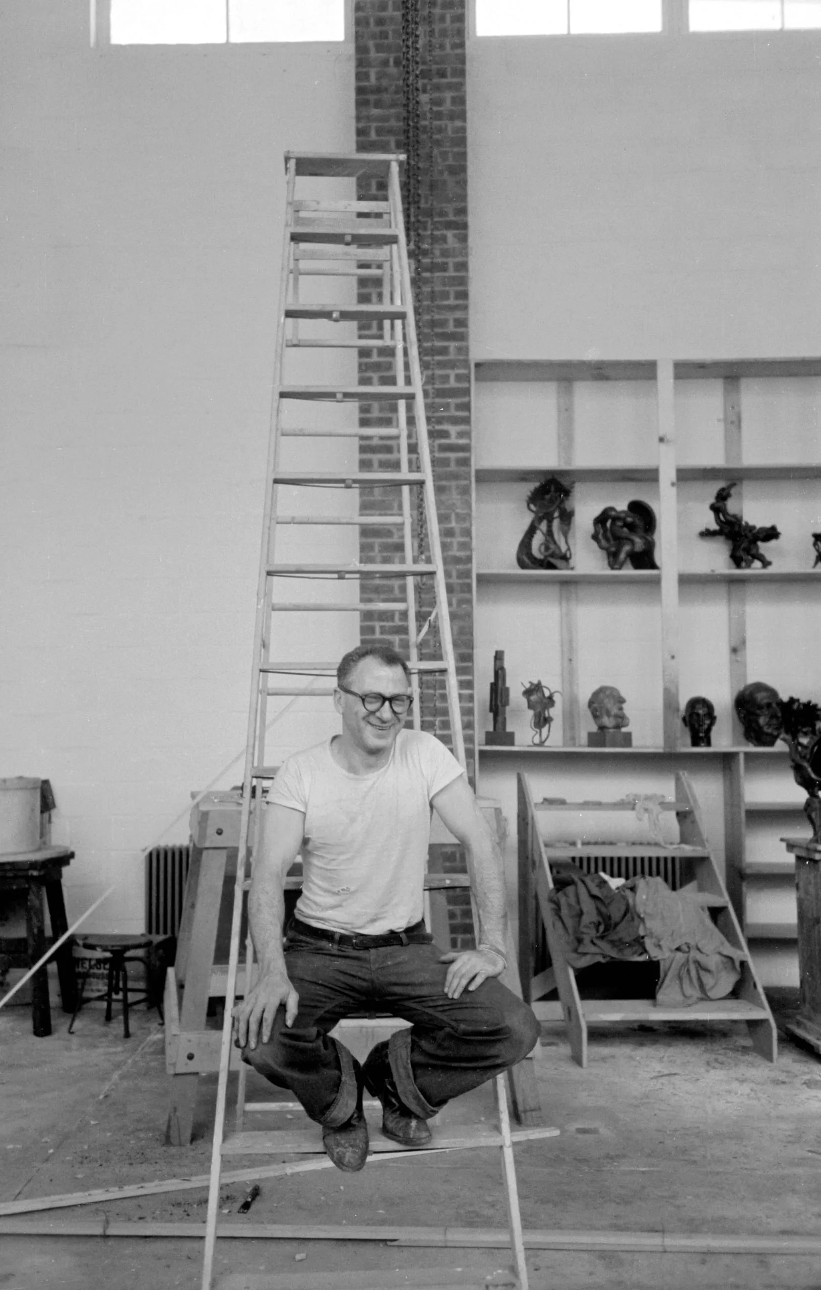 Black and white photograph of a man in a white T-shirt and dark trousers crouching on a wooden sawhorse in an artist's studio, smiling, with shelves of small sculptures visible behind him