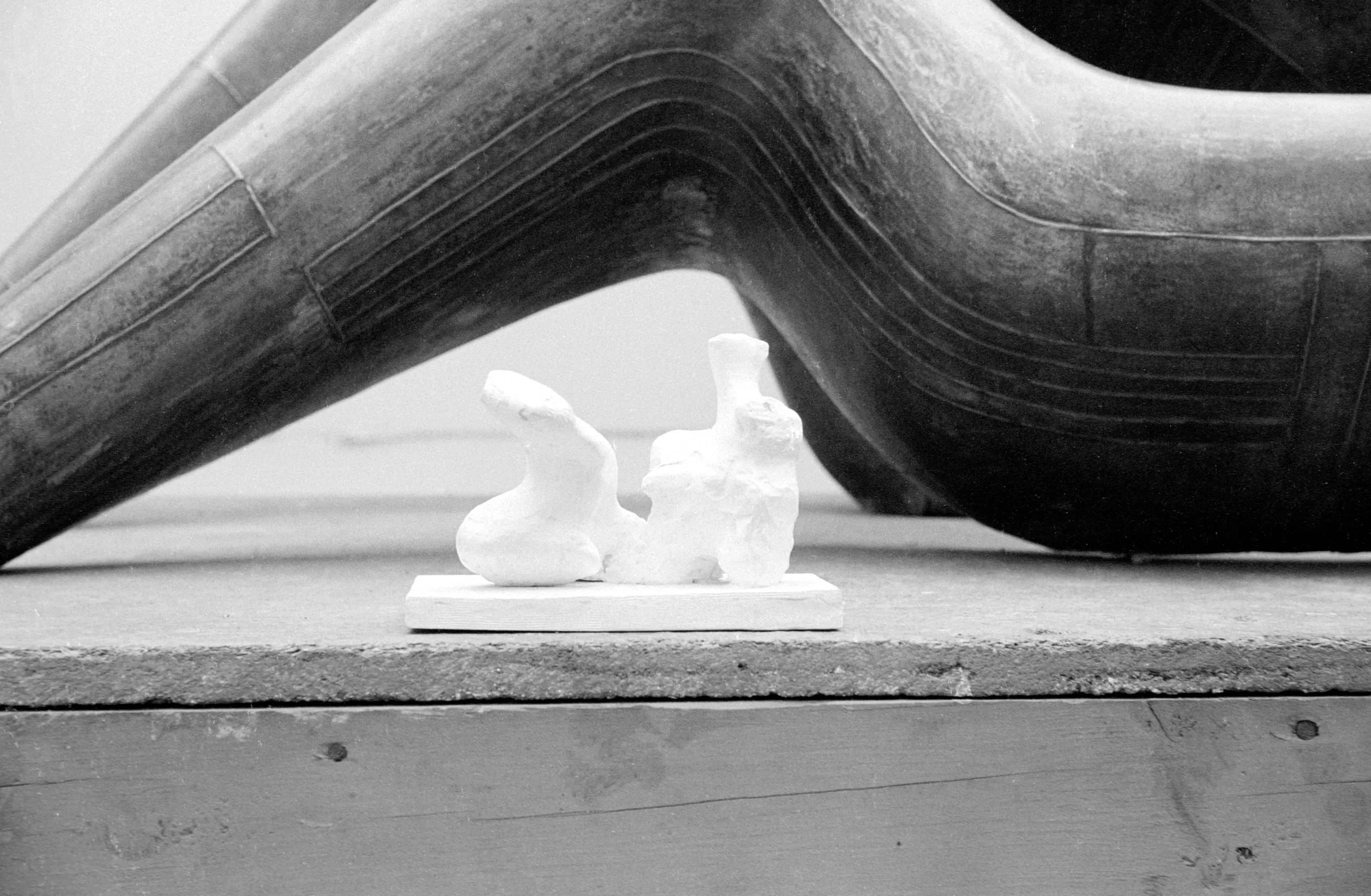 Black and white photograph of a small white plaster maquette with two organic figures on a rectangular base, placed in front of a massive dark bronze curved sculpture with horizontal striations