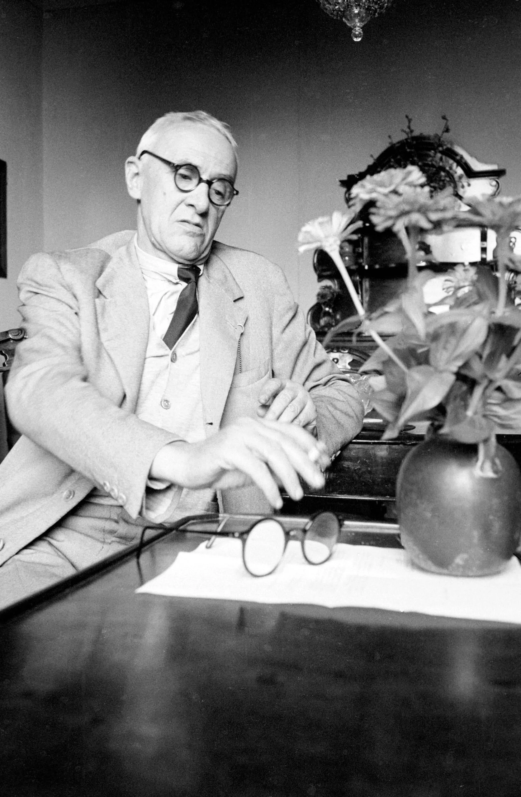 Black and white photograph of an older white man in a suit and round glasses, seated at a dark desk with a ceramic vase of flowers beside him