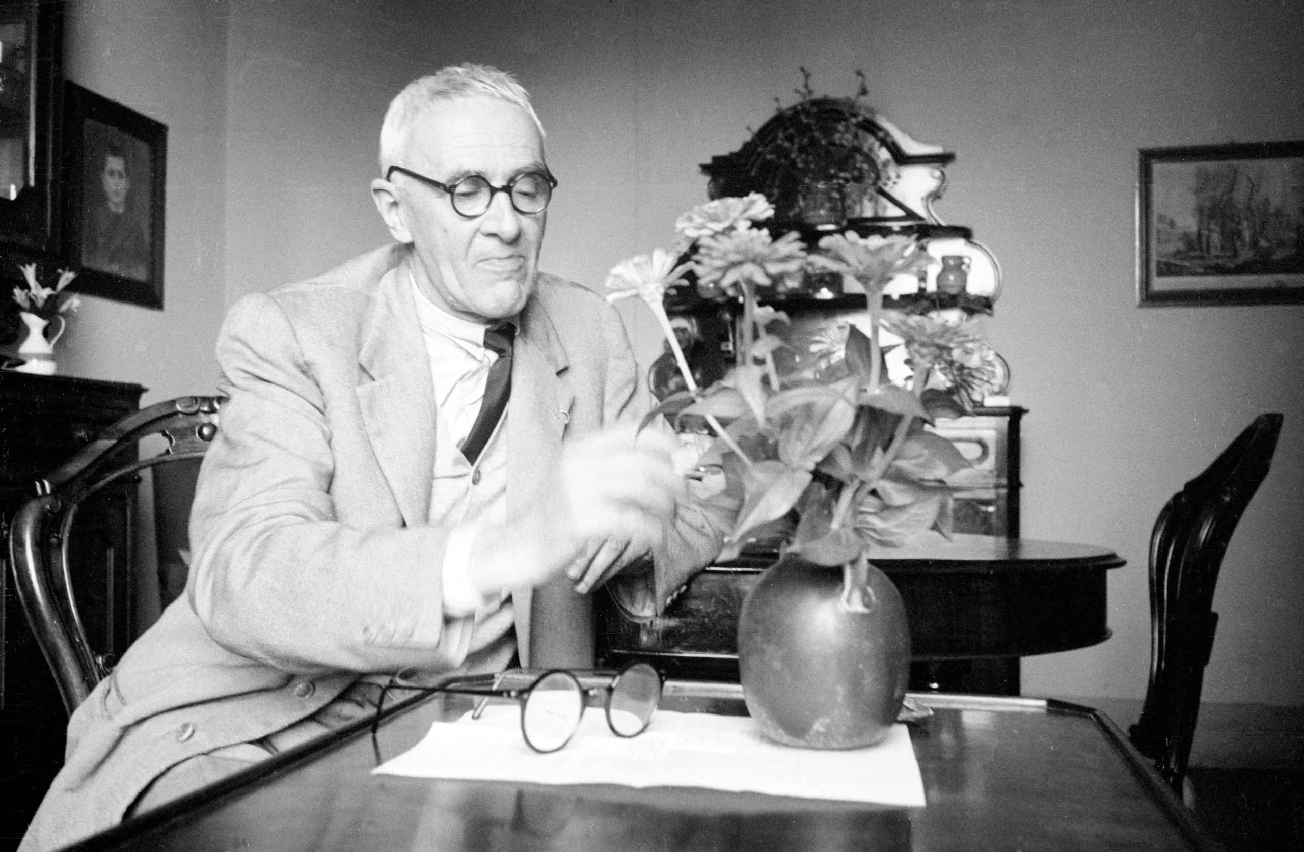 Black and white photograph of an older white man in a sport coat reaching toward a ceramic vase of flowers on a dark wooden table, his glasses resting on a sheet of paper nearby