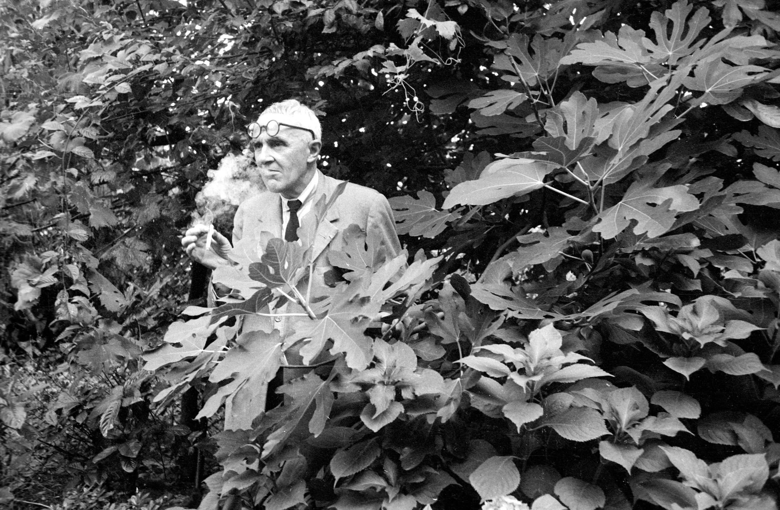 Black and white photograph of a white man in a suit and round glasses, partially framed by dense broad-leafed foliage, holding a cigarette with smoke drifting upward