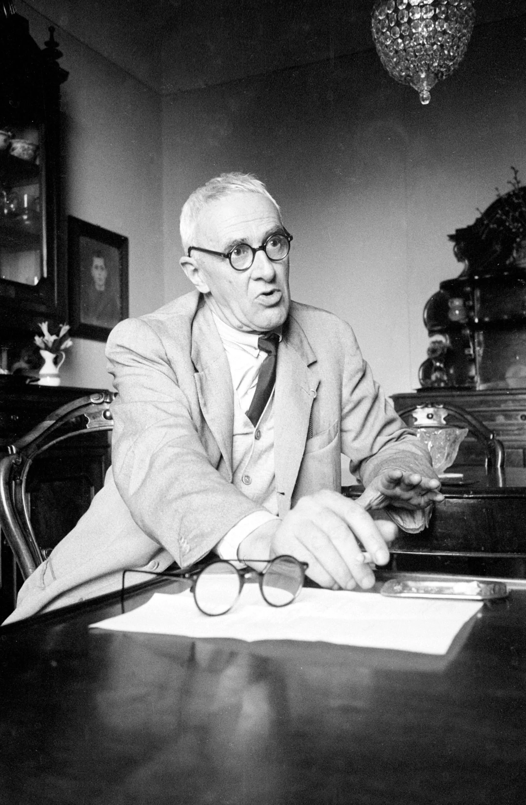Black and white photograph of a white man with short white hair, round glasses, and a rumpled suit jacket, leaning forward at a dark wooden table with papers, mouth open mid-speech