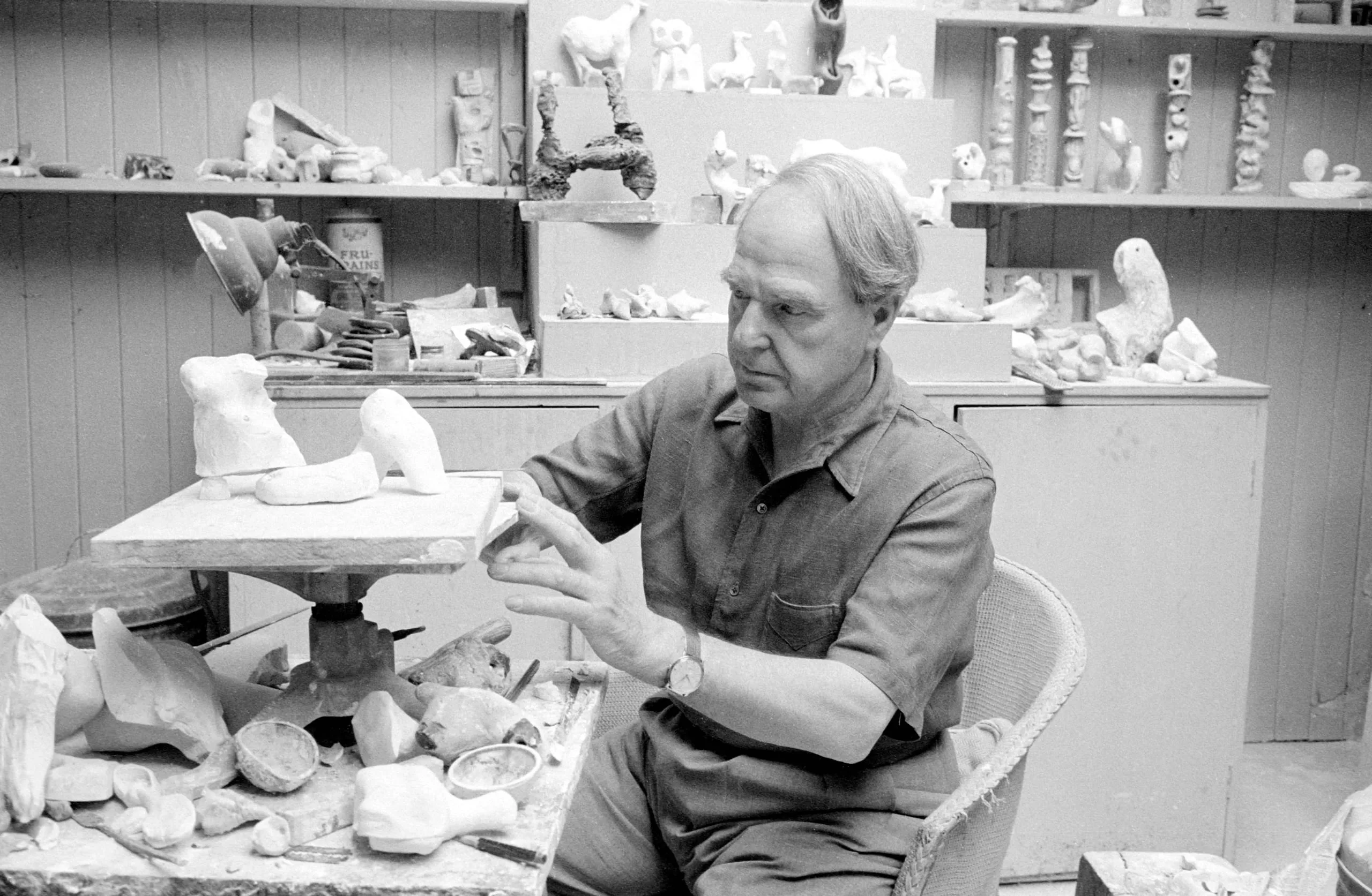 Black and white photograph of a man seated in a wicker chair in a sculptor's studio, gesturing over a table covered with small plaster maquettes and sculptural fragments, shelves of figurines behind him