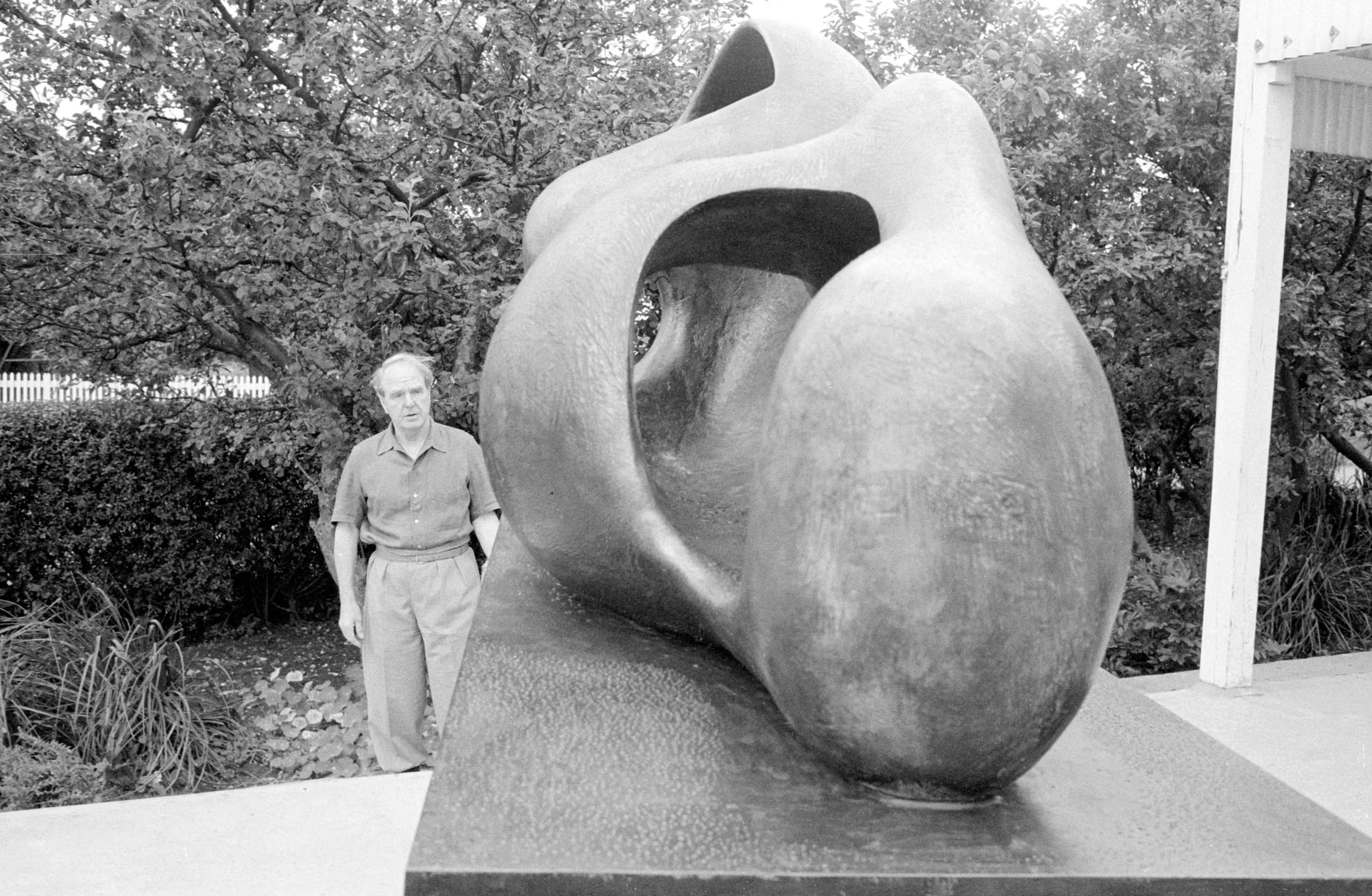 Black and white photograph of a large abstract bronze sculpture with two interlocking organic lobes and an oval void, displayed outdoors beside a standing man