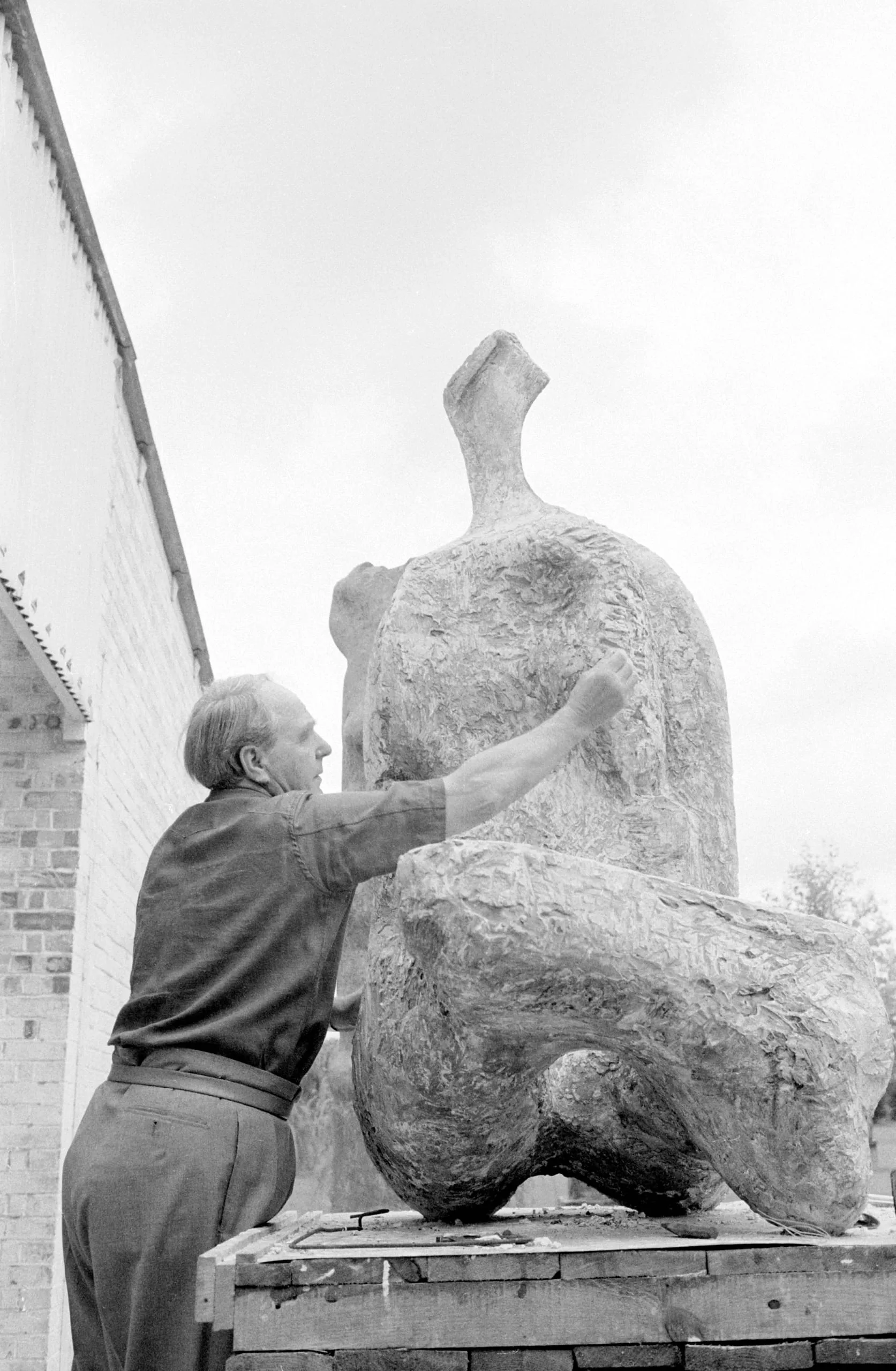 Black and white photograph of a man in short sleeves and trousers pressing his hand against a large, rough-textured abstract sculpture outdoors beside a brick wall