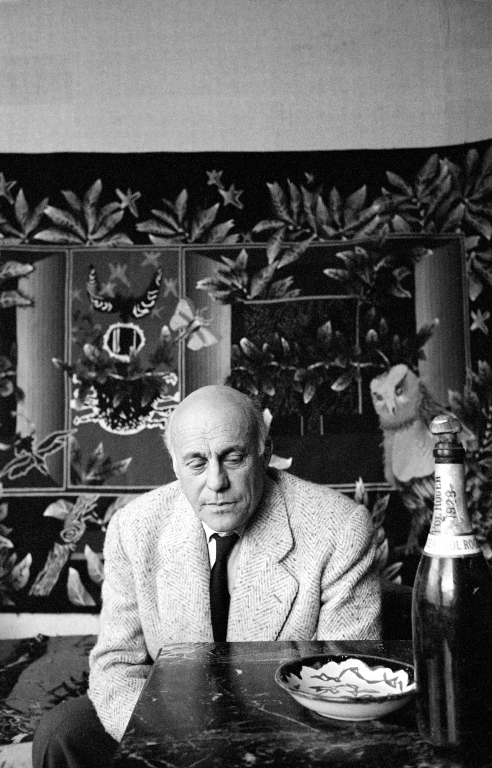 Black and white photograph of a bald older man in a tweed jacket seated at a marble table, head bowed, with a bottle and dish nearby, a decorative tapestry behind him