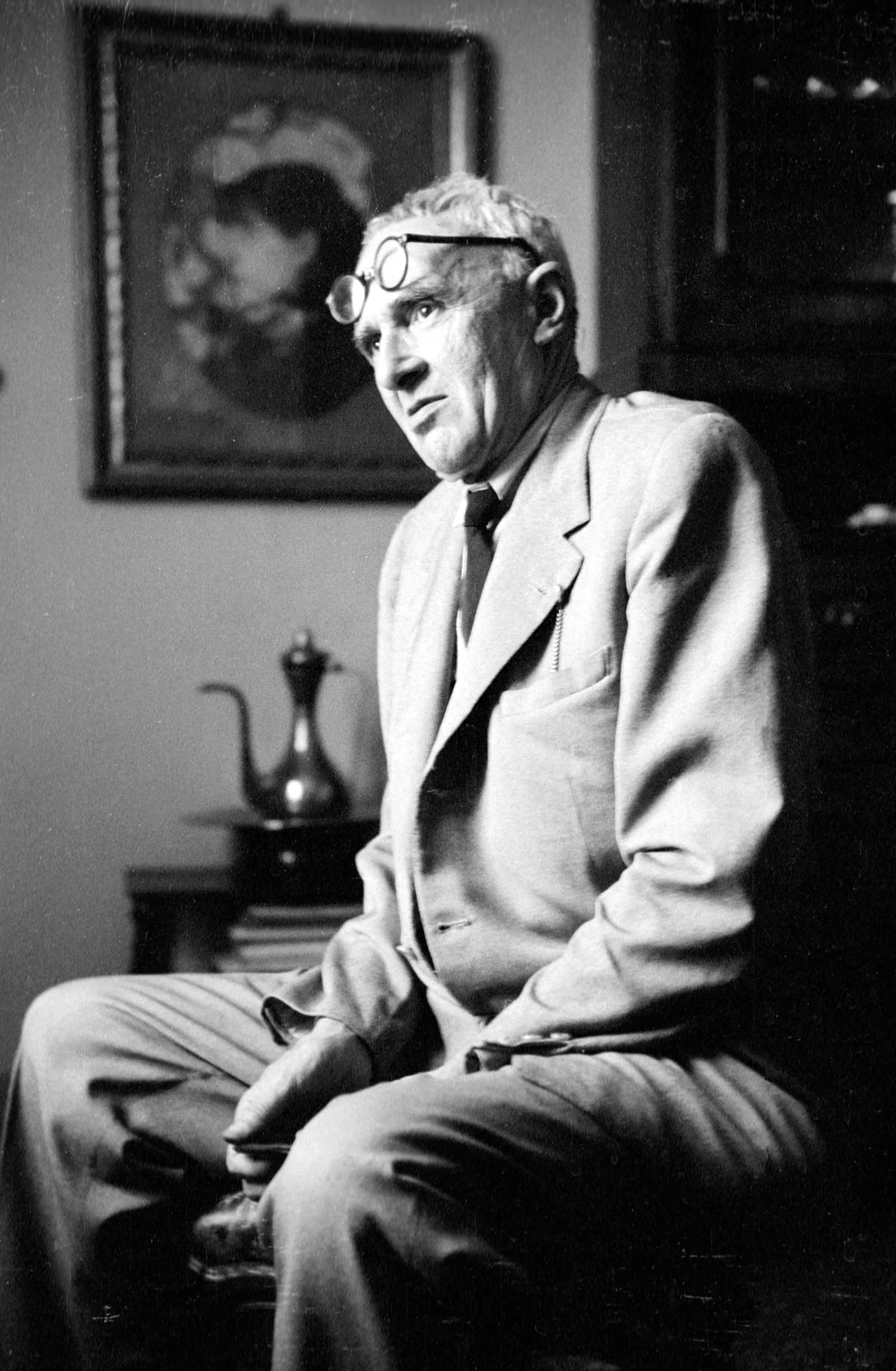 Black and white photograph of an older white man seated in three-quarter profile, wearing a light suit and round wire-framed glasses, with a framed painting visible on the wall behind him