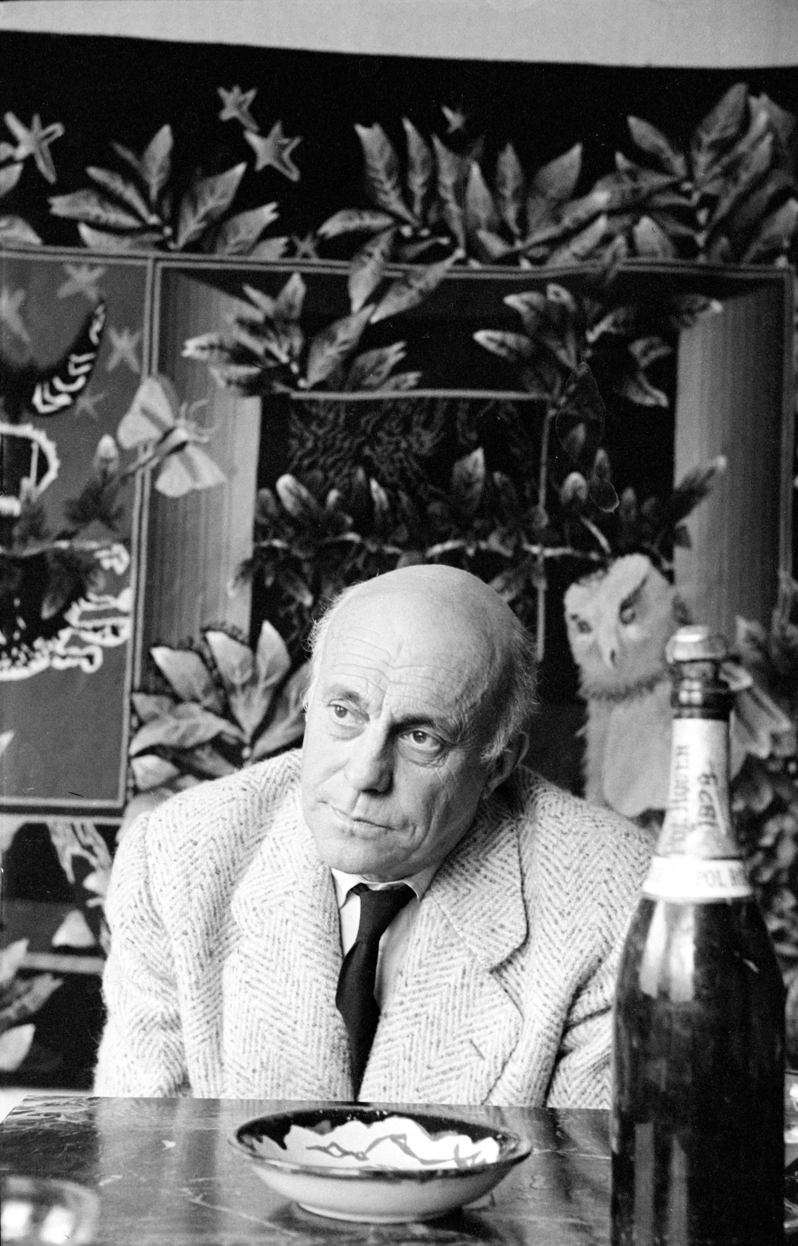Black and white portrait photograph, older white man in tweed jacket seated at a table with a bowl and large bottle, ornate botanical panel behind him