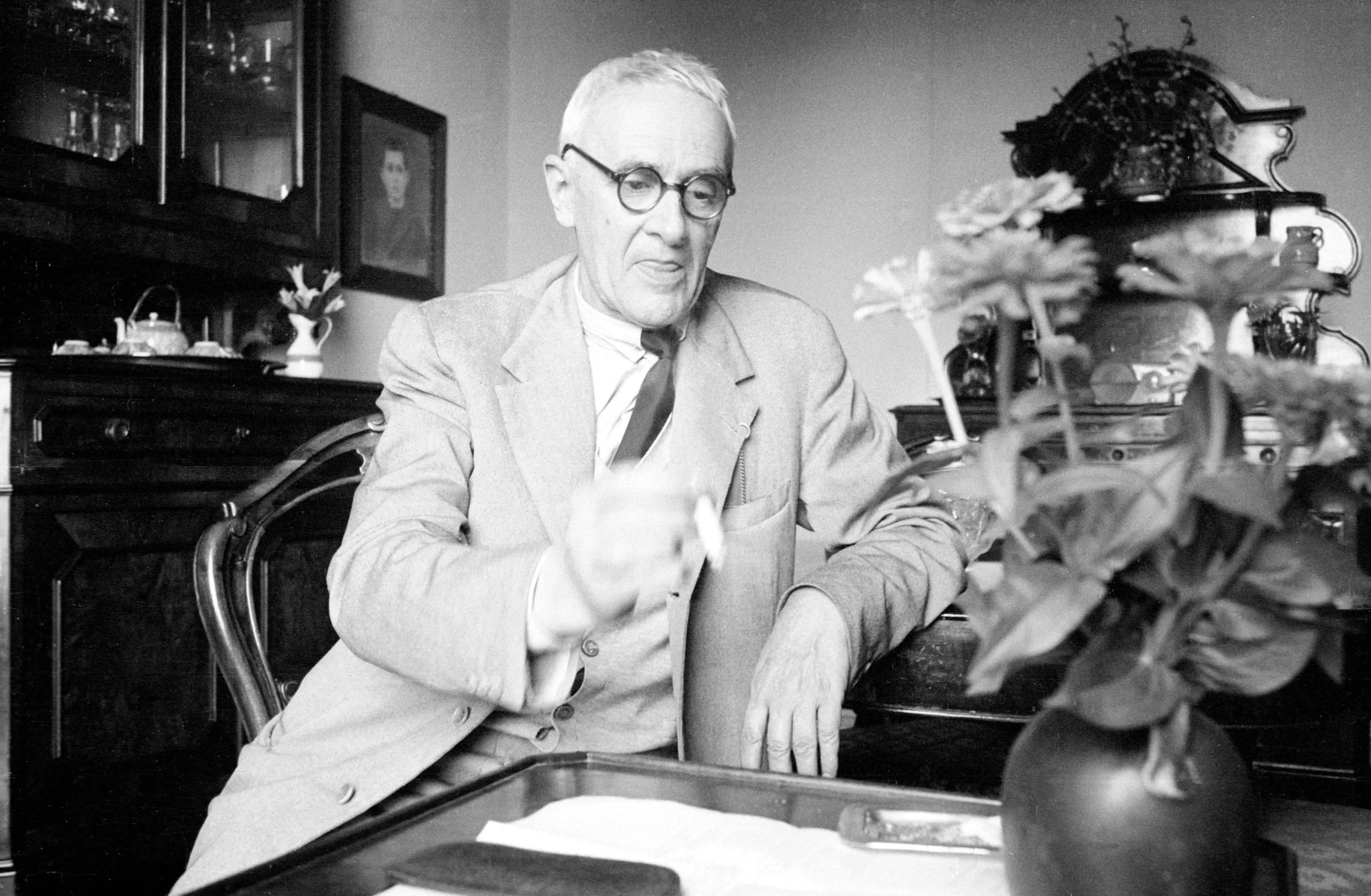 Black and white photograph of an older white man in a suit and round glasses, seated at a dark wooden desk, one hand raised mid-gesture