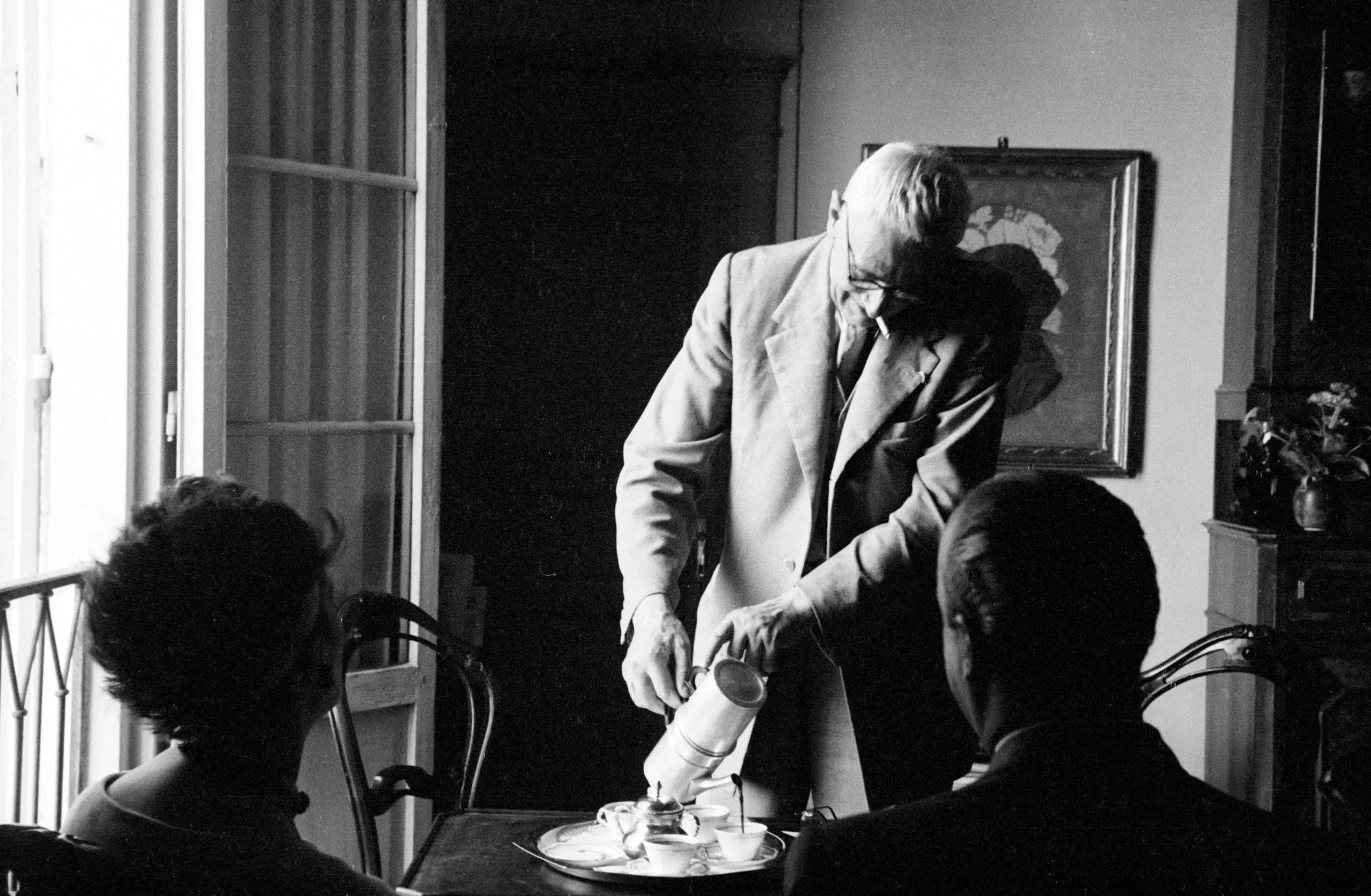 Black and white photograph, an older white man in a light blazer leans over a small table pouring from a pitcher, two figures seated with backs to camera in shadow
