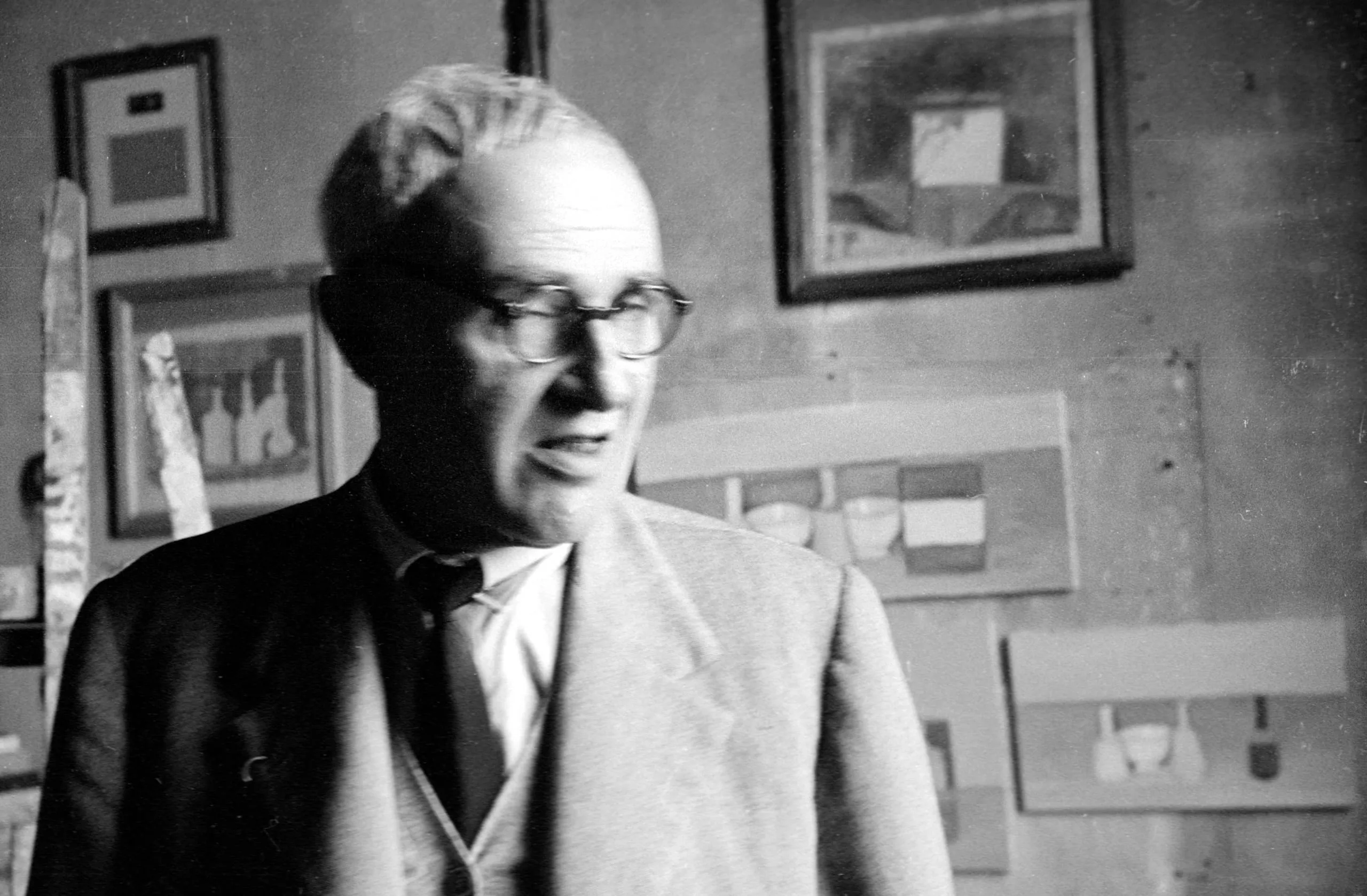 Black and white photograph, chest-up portrait of an older white man in glasses, blazer, and tie, with abstract artworks visible on the wall behind him