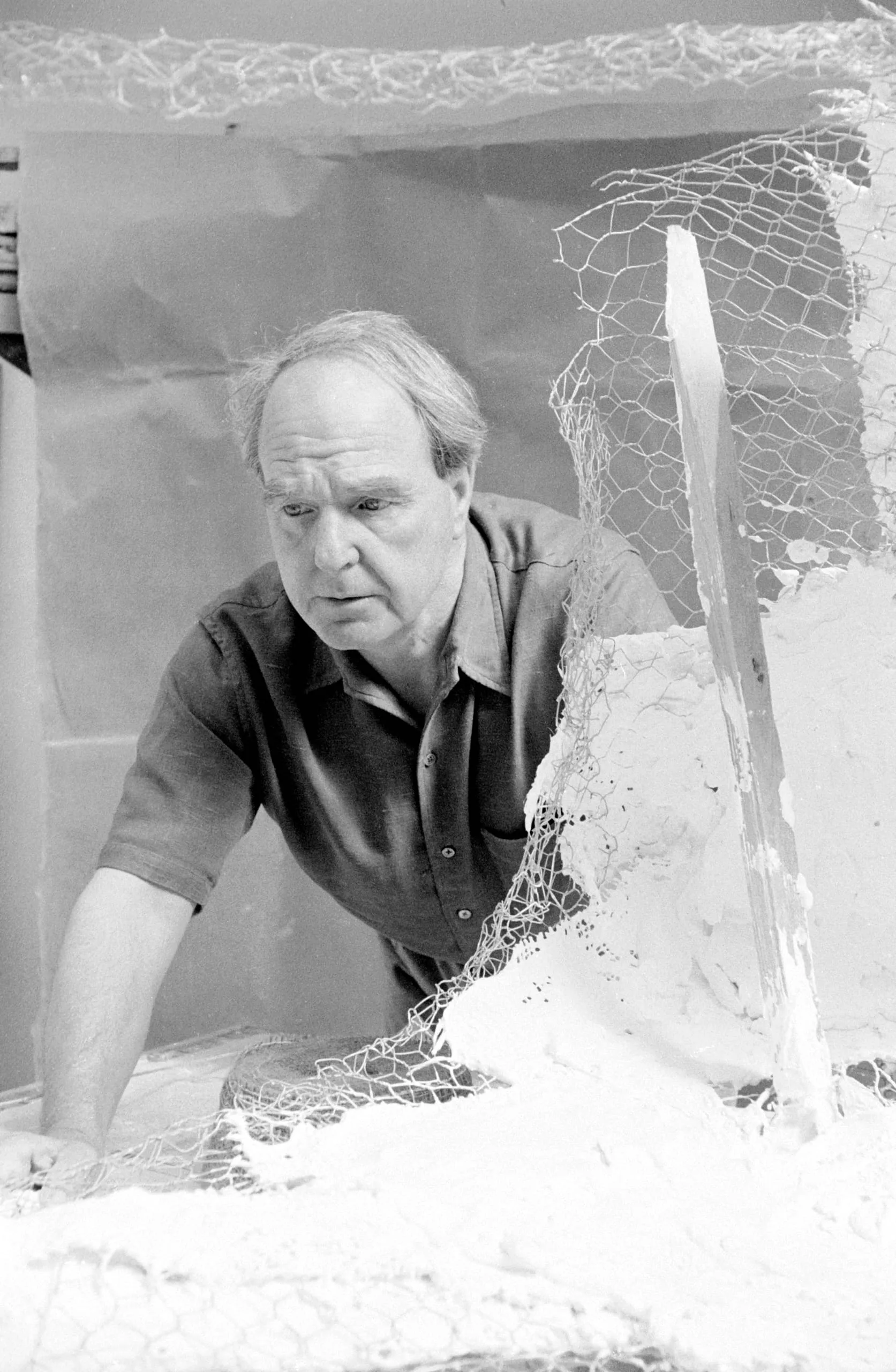 Black and white photograph, a man in a dark polo shirt leans over a work surface covered in white plaster material, with chicken wire mesh in the foreground and background