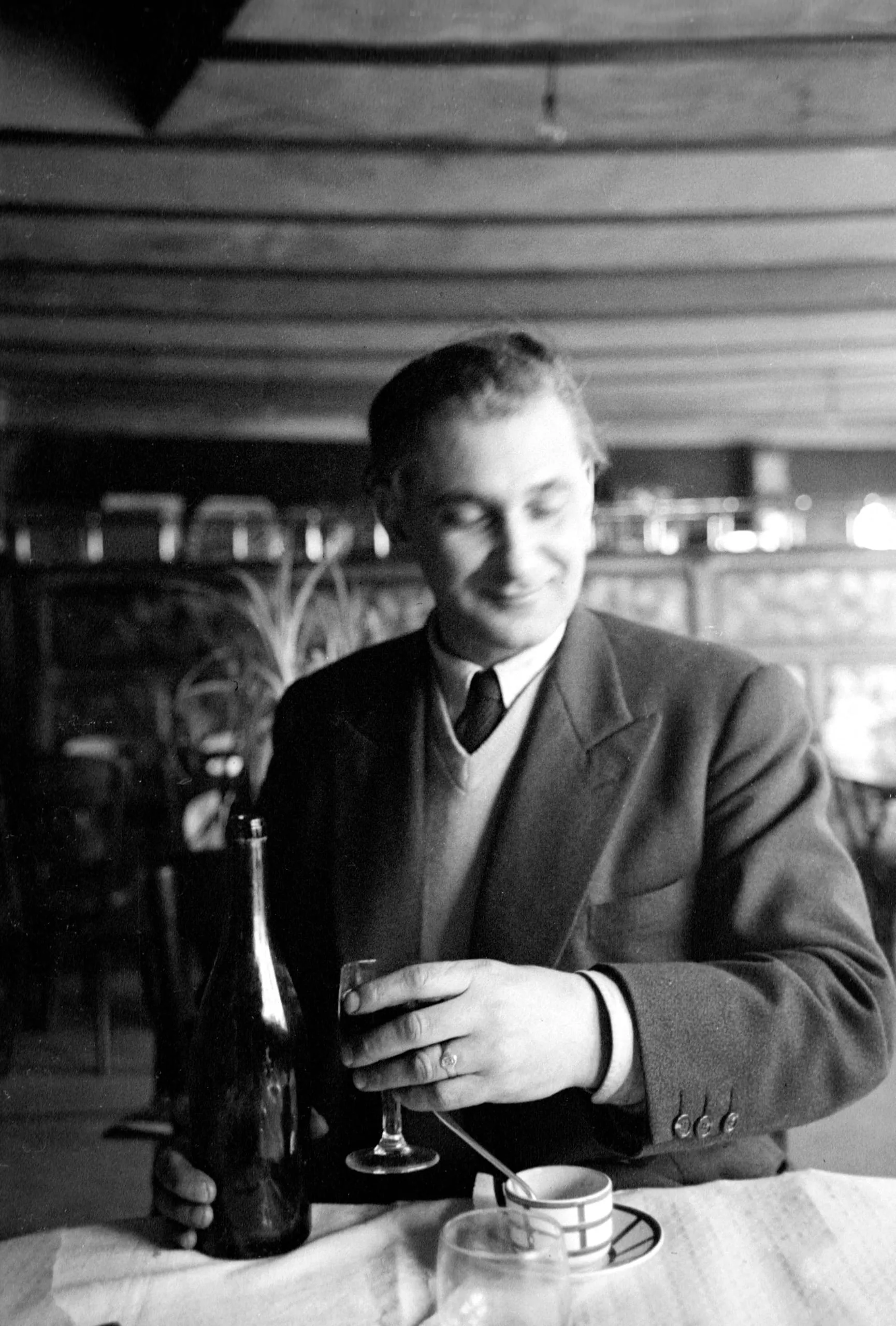 Black and white photograph of a man in a blazer and tie seated at a café table, looking down at a wine glass he holds in both hands, bottle and cup nearby