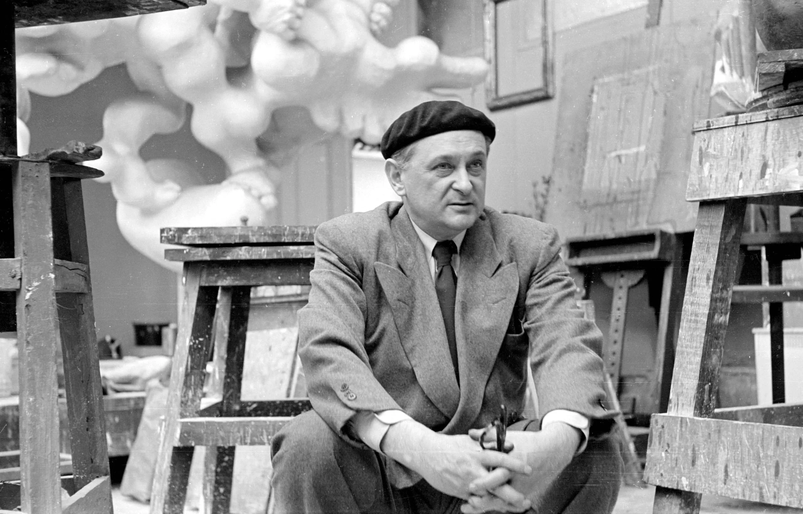 Black and white photograph of a white man in a beret and suit jacket seated in an artist's studio, with a large white plaster sculpture visible behind him
