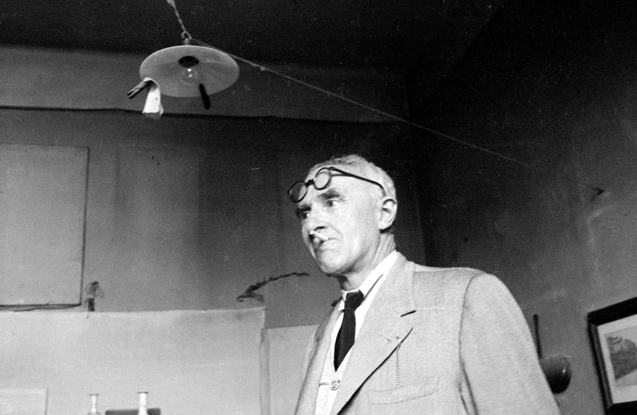 Black and white photograph of a white man in a pale suit and dark tie, round glasses pushed up on his forehead, looking upward to the left in a sparse interior
