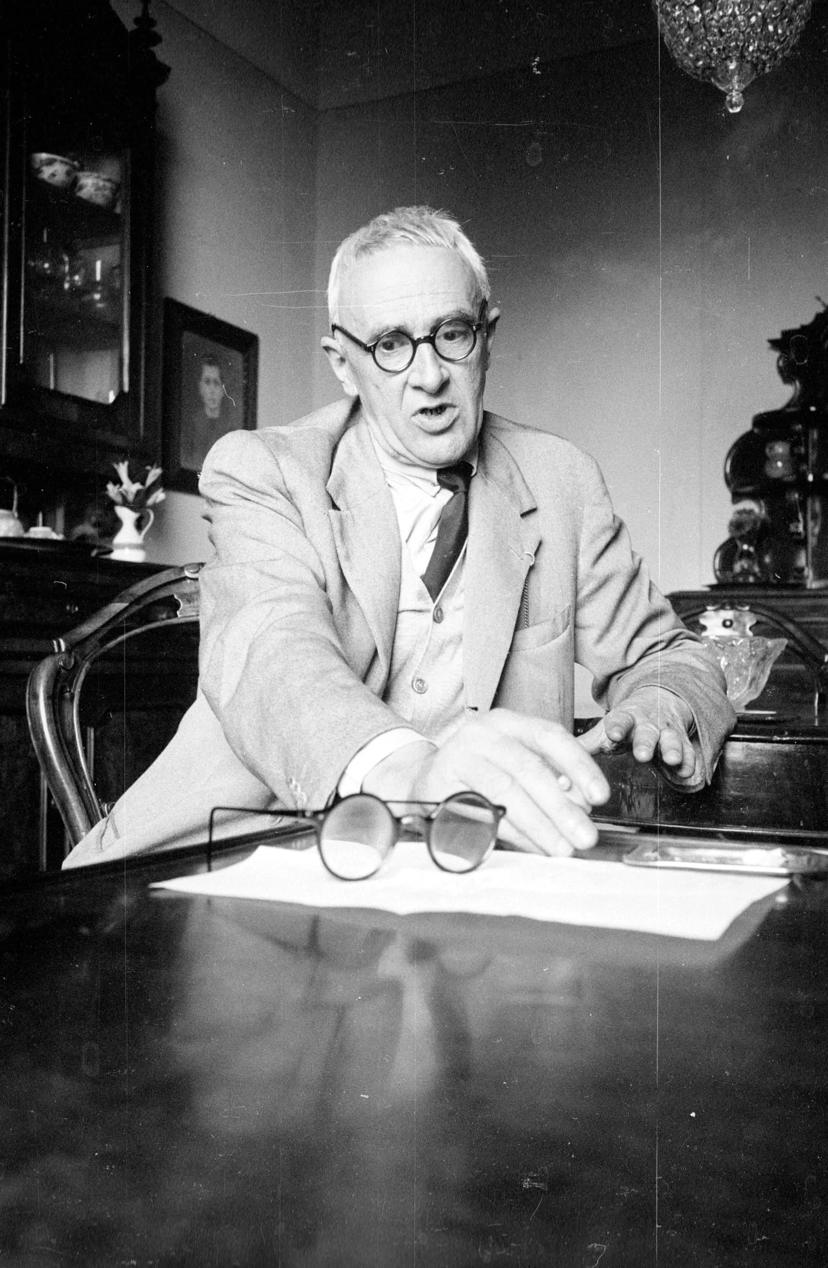 Black and white photograph, older white man in a light suit seated at a dark table, leaning forward with hands on the surface, glasses and paper in front of him