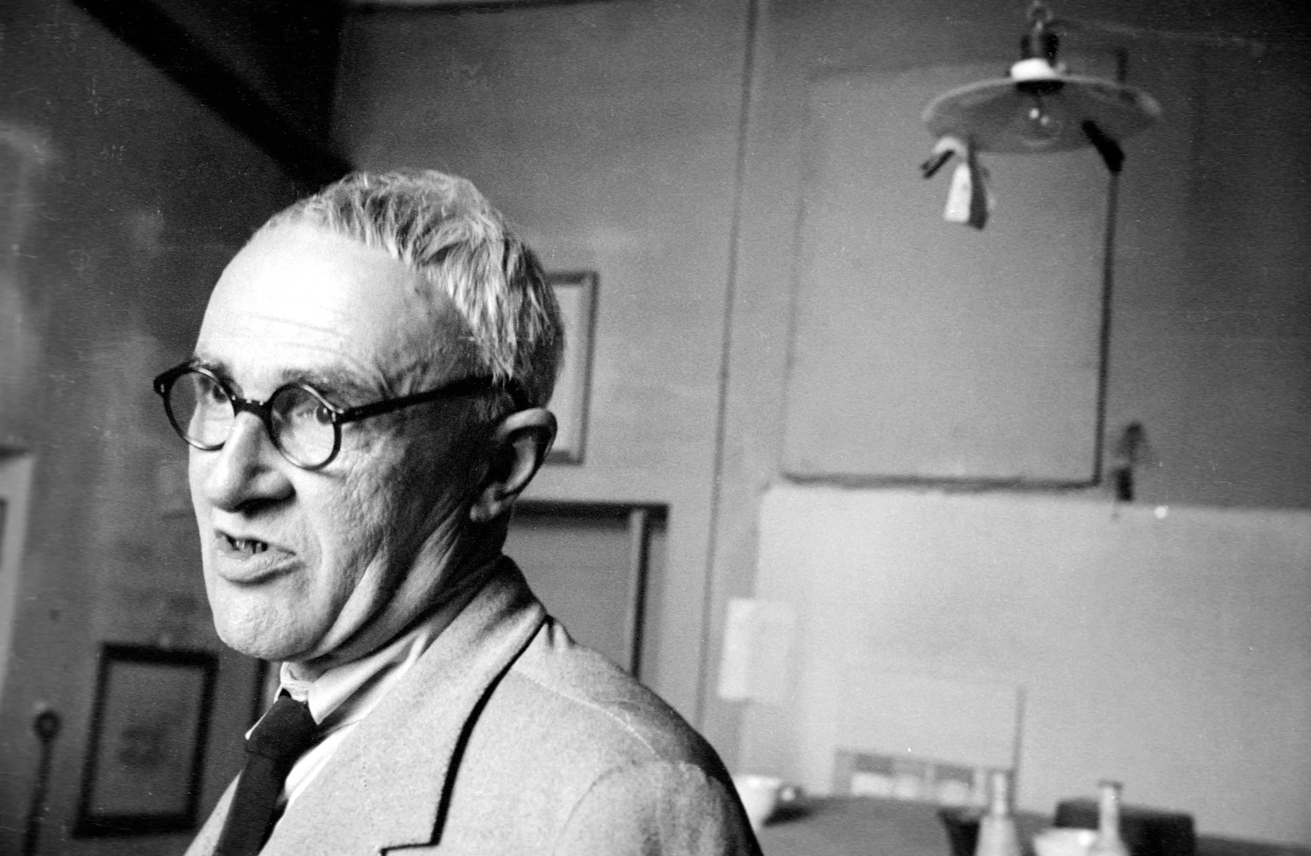 Black and white photograph of a white man in round glasses and a blazer, shown from the chest up, turned in profile, mouth slightly open