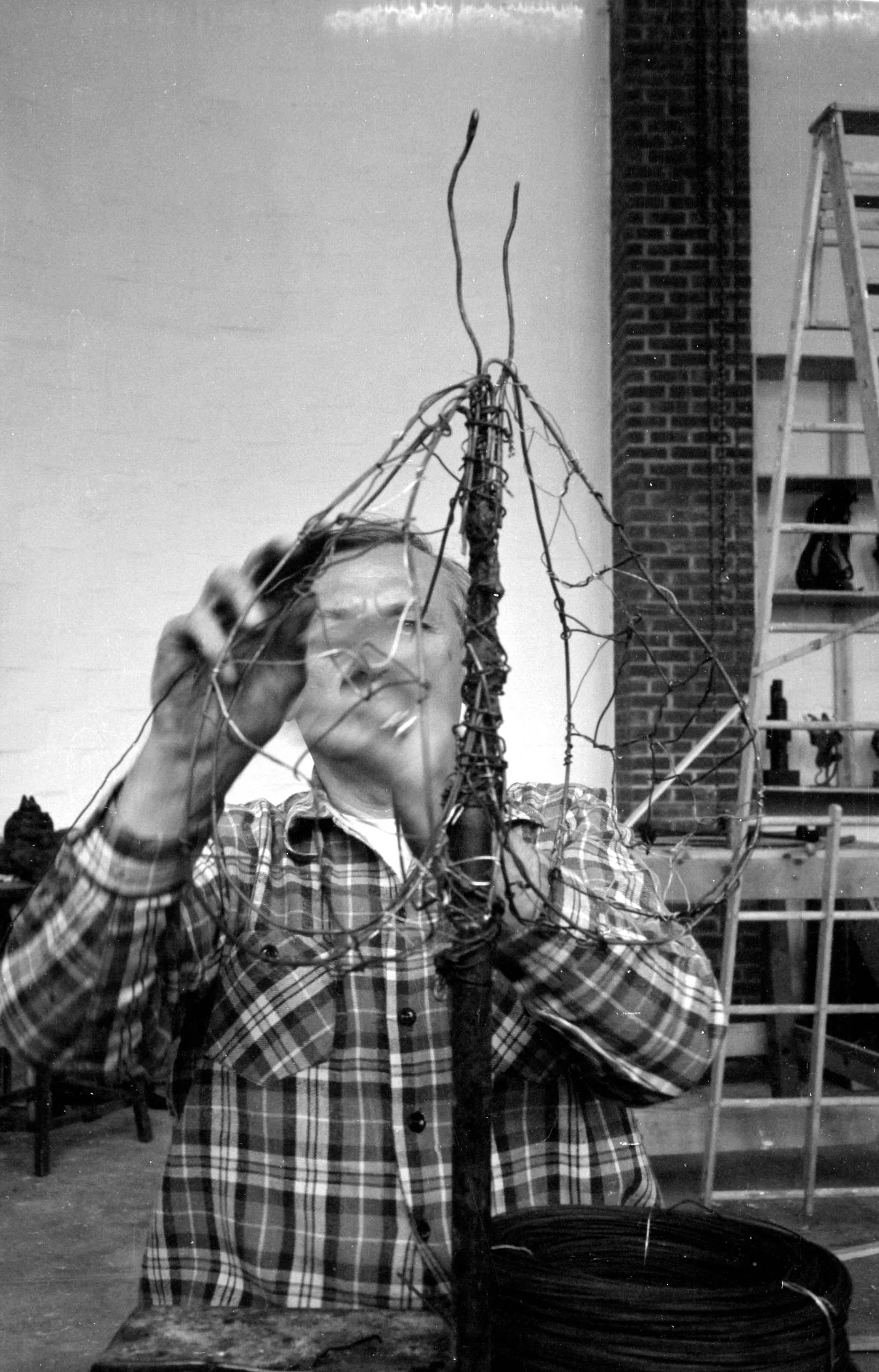 Black and white photograph of a man in a plaid shirt working with a cone-shaped wire and branch armature in a studio, hands raised into the structure