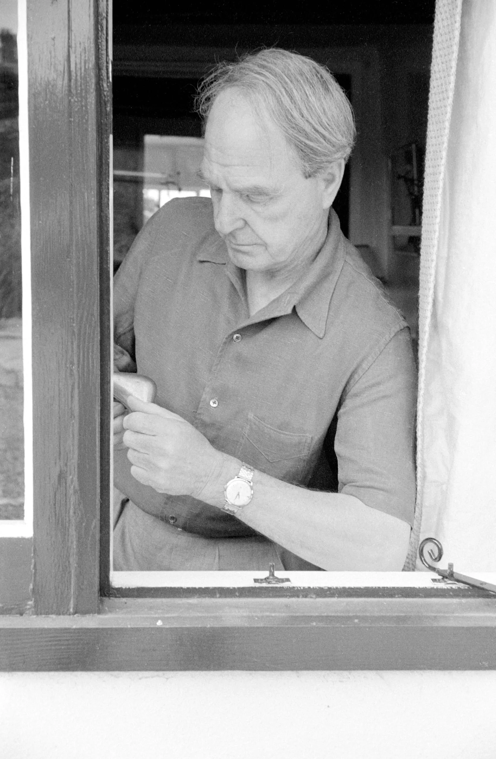 Black and white photograph of a white man in a short-sleeved collared shirt, seen through an open wooden window frame, looking down at his hands