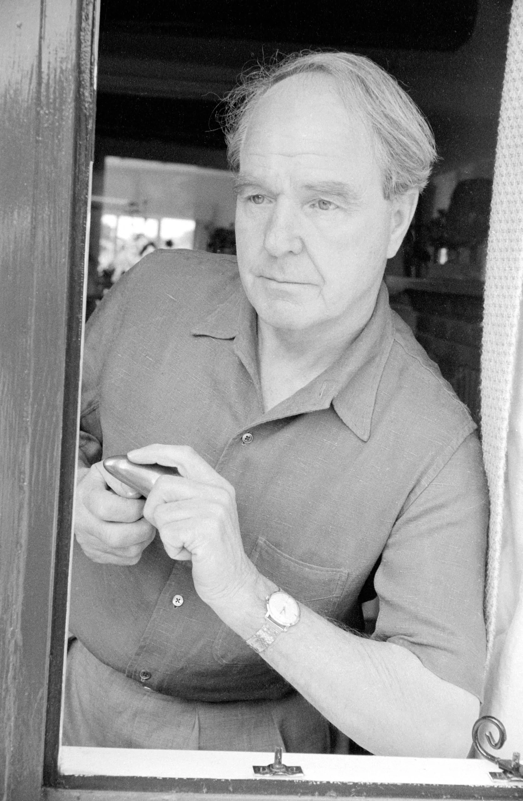 Black and white photograph of a man leaning through an open window, hands clasped at chest height, looking directly at the camera
