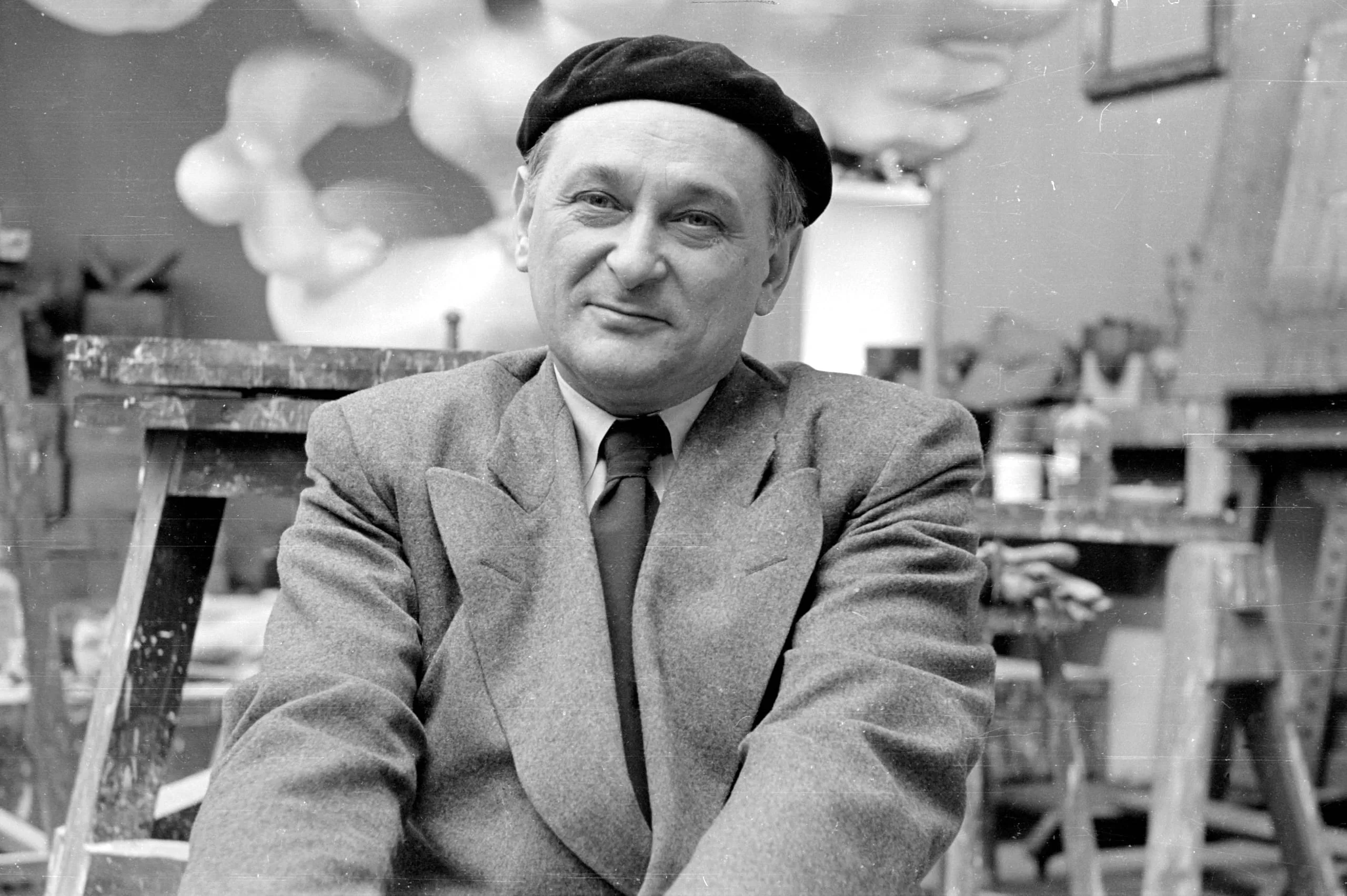 Black and white photograph of a middle-aged white man in a beret and blazer, arms folded, seated in a studio with blurred sculptural forms behind him