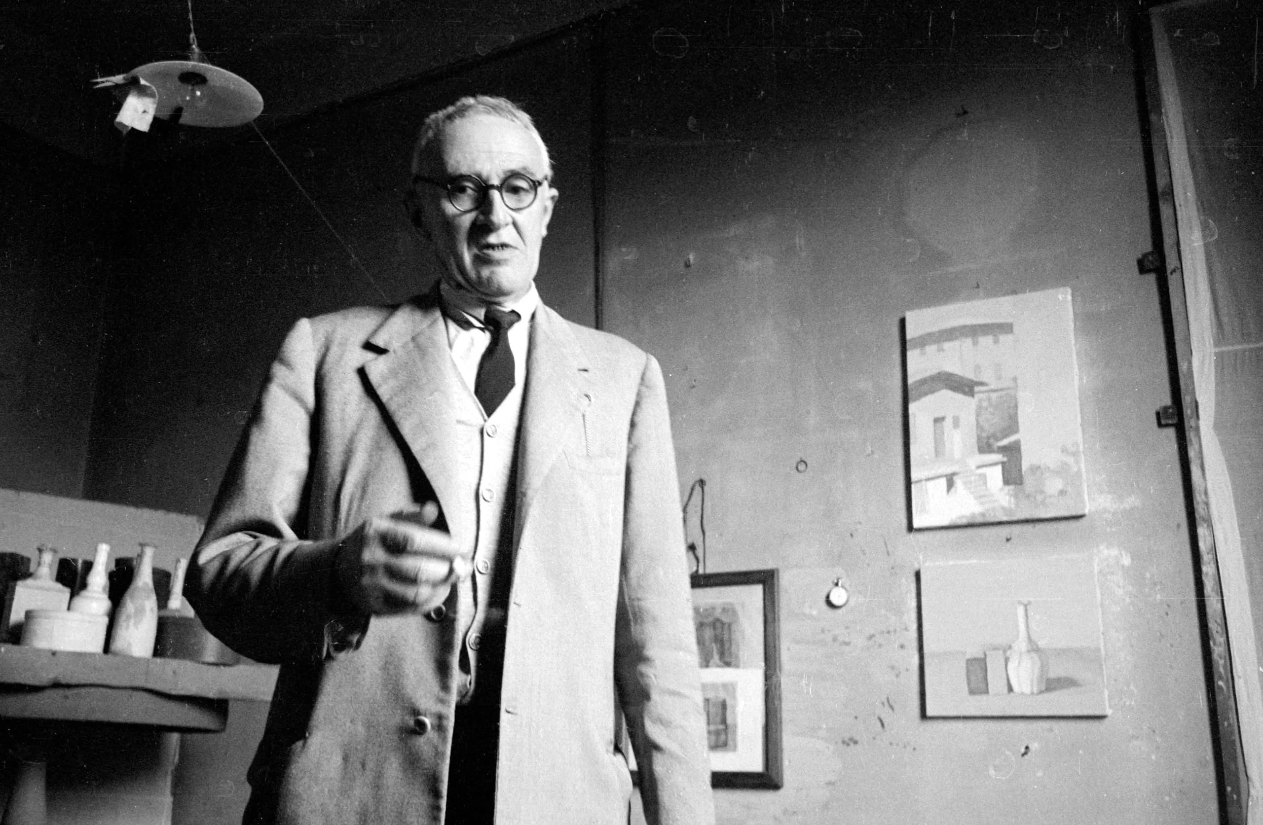 Black and white photograph of a white man in a suit and round glasses, mid-gesture in a studio with ceramic vessels and paintings visible behind him